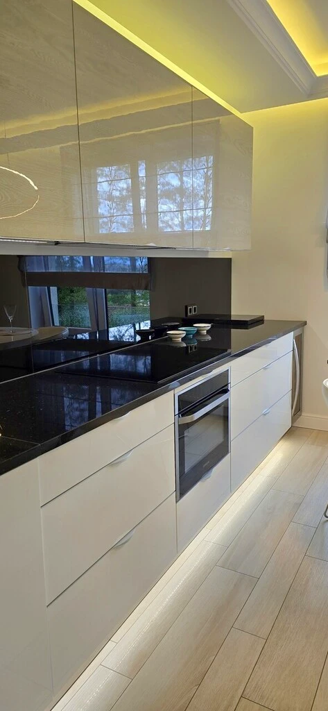 - Küche: Arbeitsflächen aus schwarzem Granit, moderne Einbaugeräte von Samsung (Serie: Cheff Collection), große Induktionskochfeldplatte von Electrolux, Weinkühlschrank