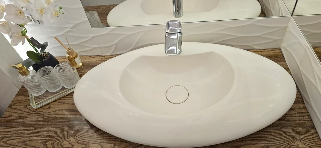 - Badezimmer: Edle Fliesen von Grespania, exklusive Waschtischkombination aus weißem Marmor (Marmorin), Armaturen von Kludi, großzügige Duschnische