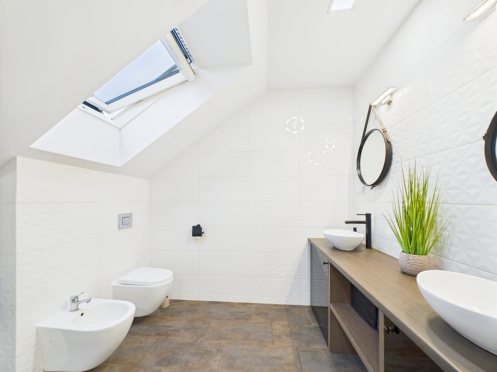 - Bad mit Doppelwaschtisch, Handtuchheizkörper, Dusche, Fenster