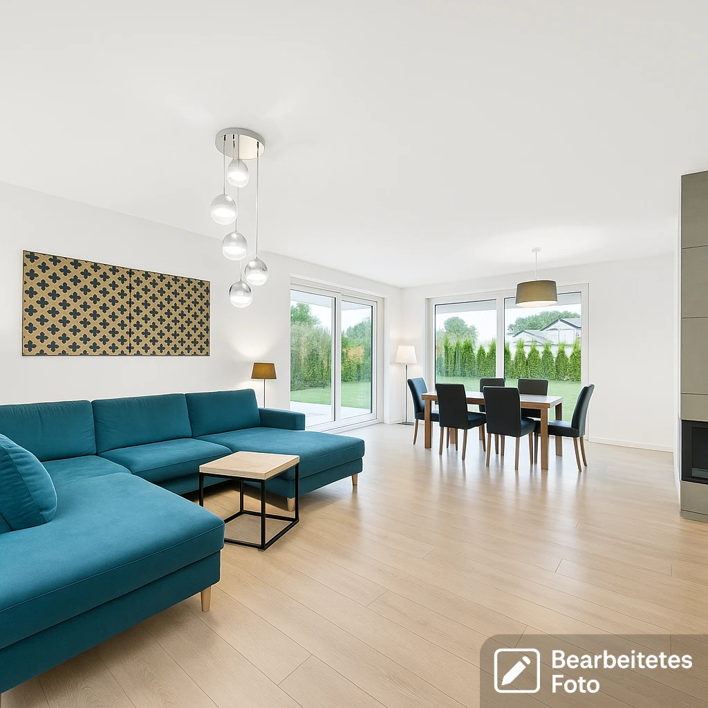 und Panoramafenstern für viel Tageslicht – direkter Zugang zur Terrasse und in den Garten - Offene Küche mit Essbereich – ca. 50 m² – inklusive Einbaumöbeln und hochwertigen Elektrogeräten
