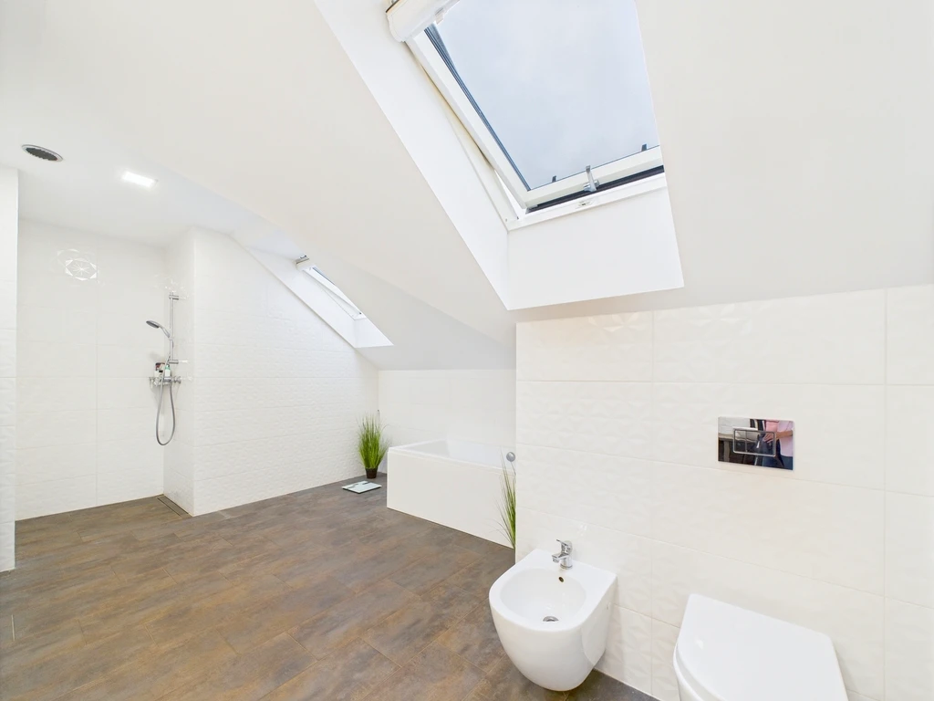 - Großes Badezimmer (9,78 m²) mit Badewanne, Dusche, WC und Fenster