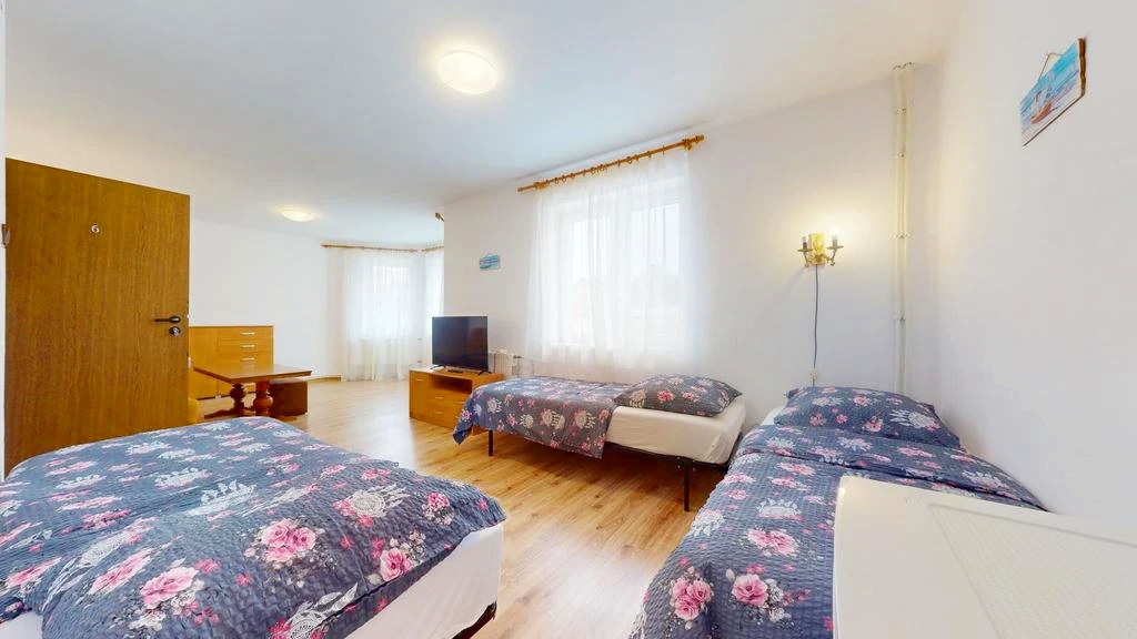 Dachgeschoss (79 m²): - Doppelzimmer mit Bad - Doppelzimmer mit Balkon und separatem Bad auf dem Flur - Dreibettzimmer mit Bad - Familienzimmer mit drei Räumen und Bad auf dem Flur