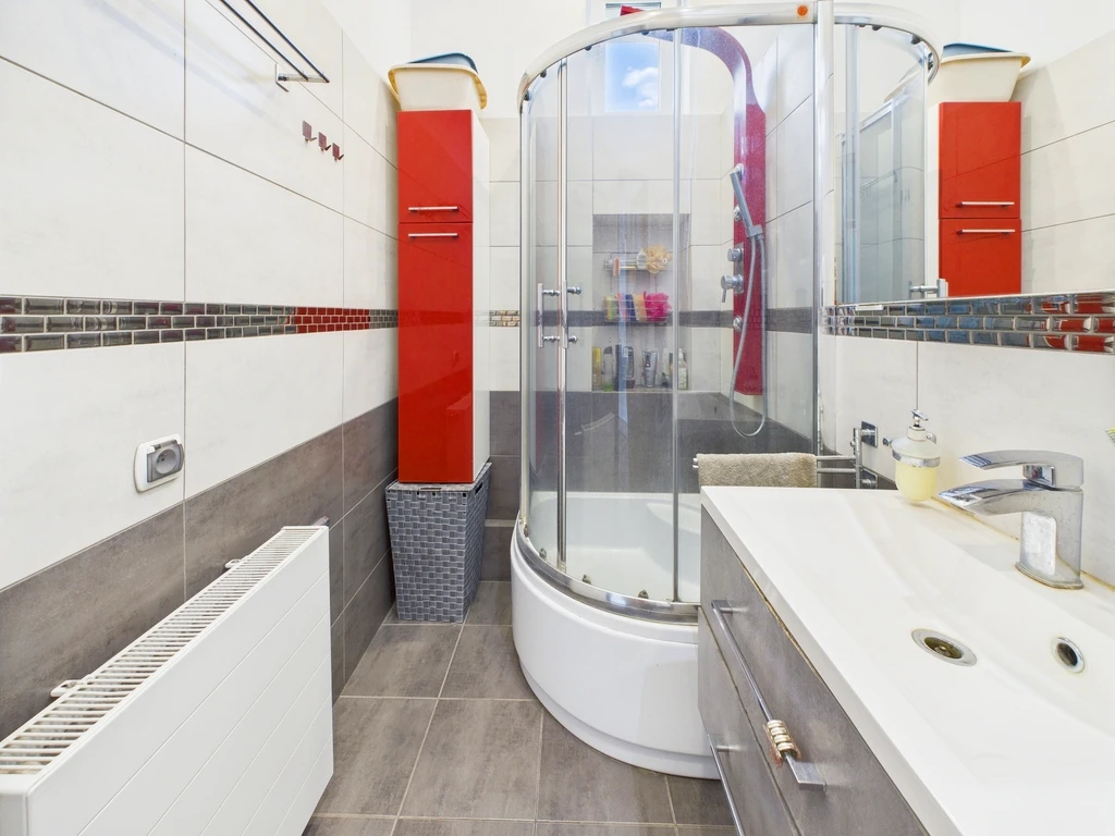 - Zeitgemäßes Badezimmer mit Dusche und eleganter Sanitärausstattung.