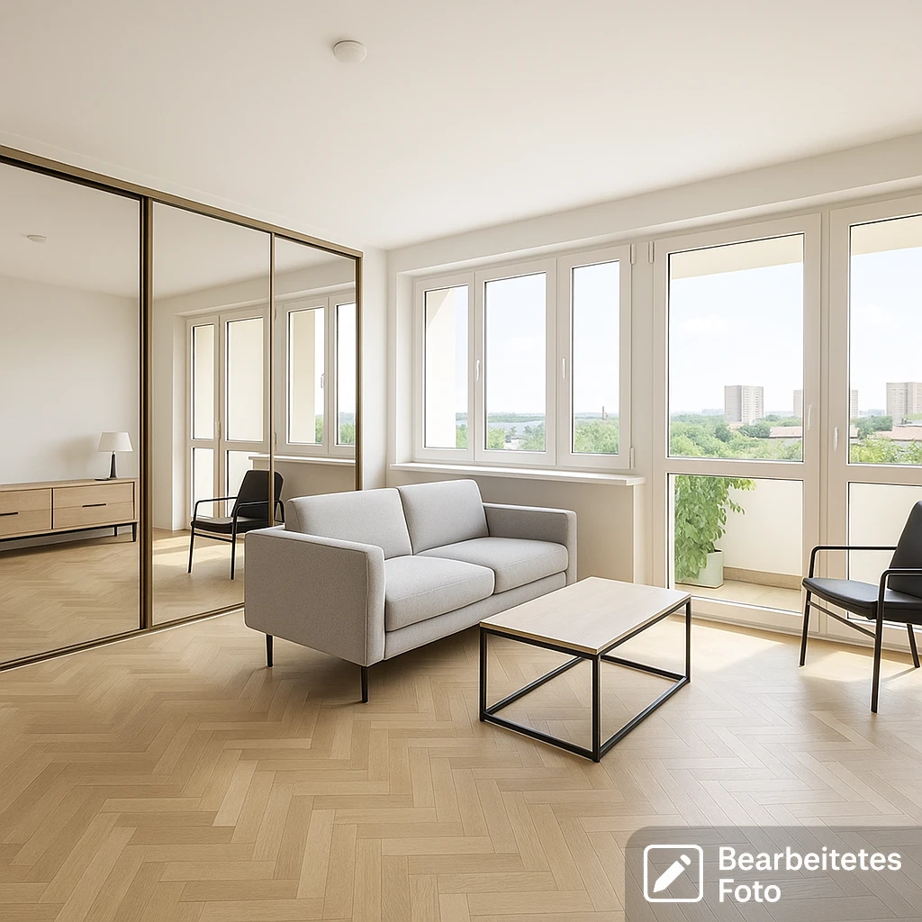 - Geräumiges Wohnzimmer mit Zugang zum Balkon – genießen Sie den weiten Blick über die Stadt