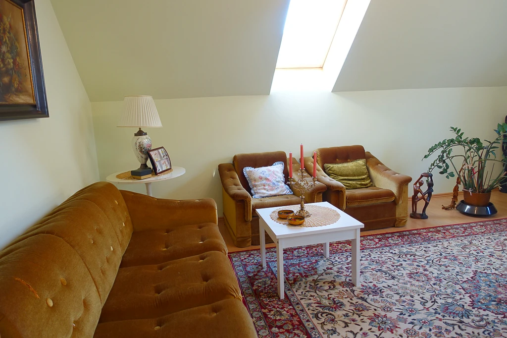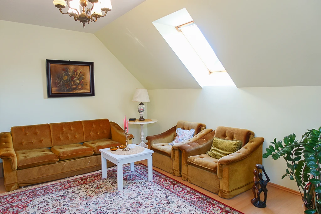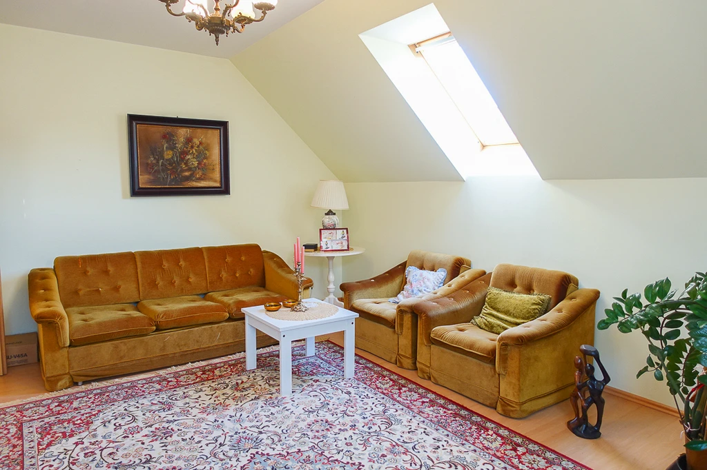 Zugang über eine ausziehbare Treppe vom Flur aus. Der Dachboden ist isoliert, hat in der Spitze eine Höhe von etwa 2,65 m und bietet drei separate Abstellräume mit Dachfenstern.