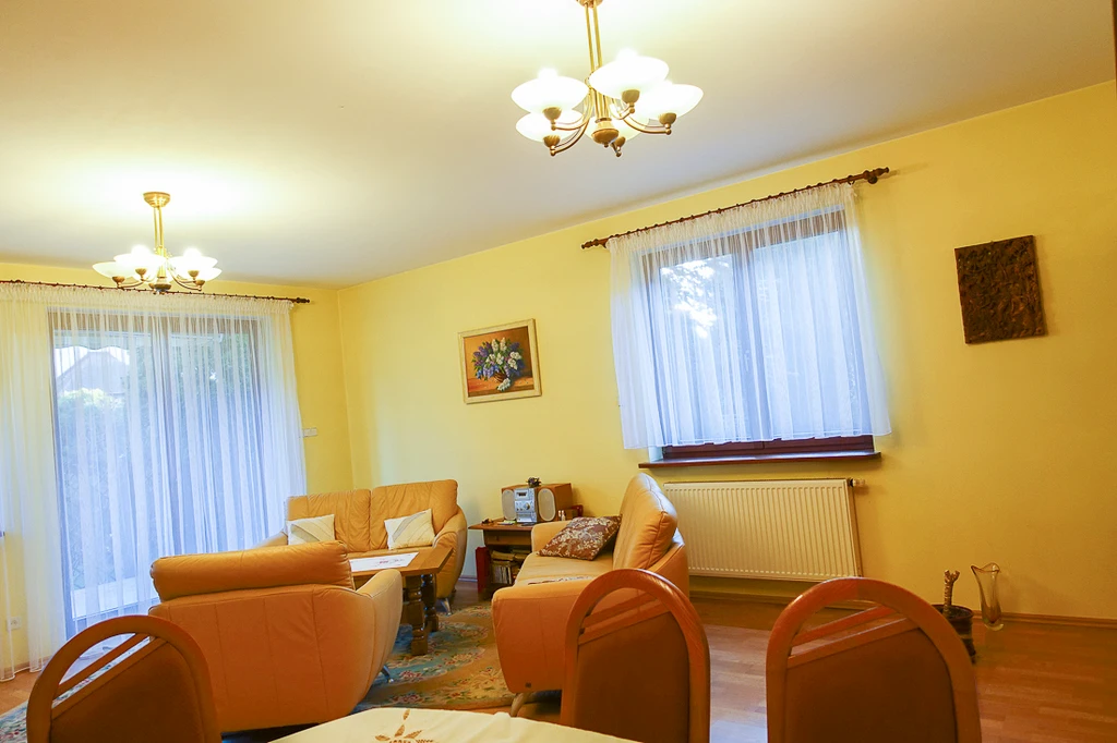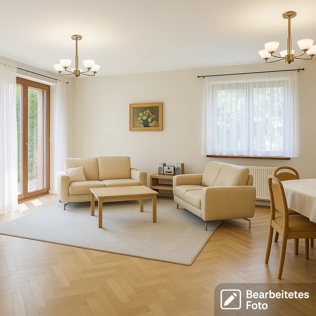 - Geräumiger Wohnbereich (32 m²) mit Kamin und direktem Zugang zur Terrasse und zum Garten