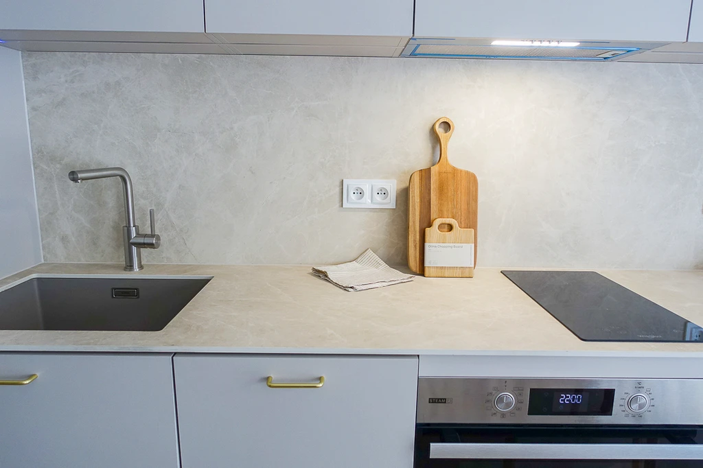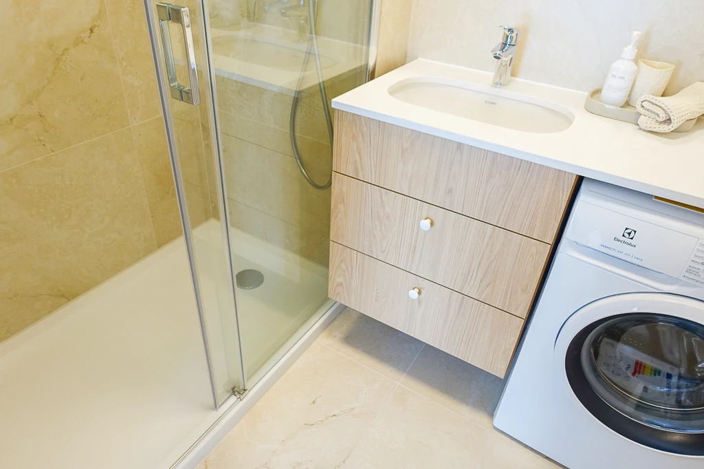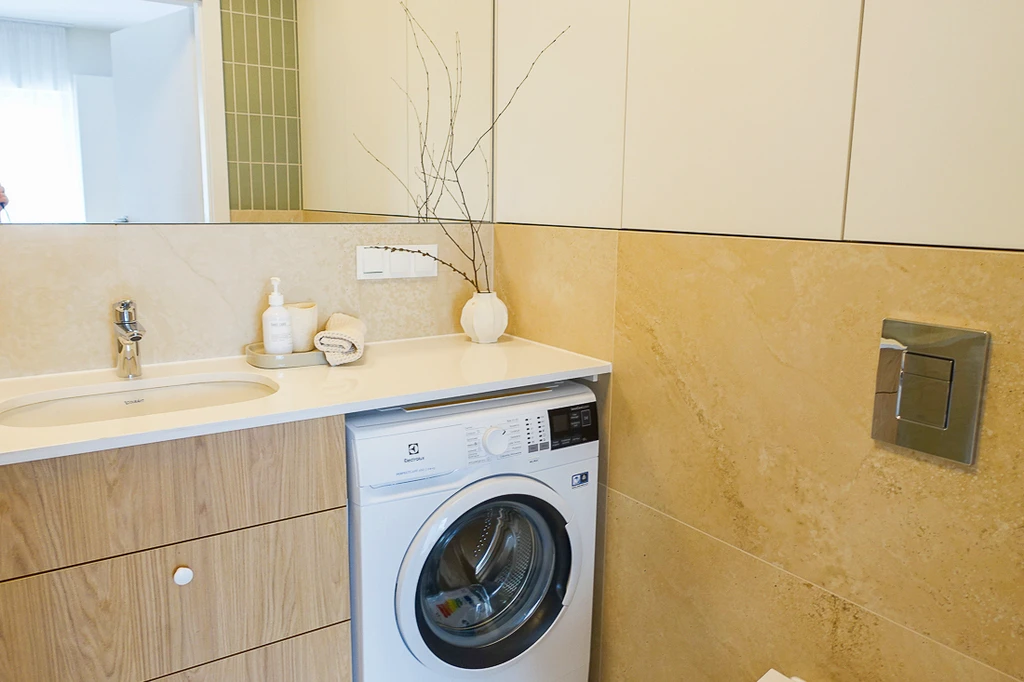 Die Wohnung wird voll möbliert und bezugsfertig übergeben: - Einbauküche inklusive Induktionskochfeld, Backofen, Geschirrspüler (45 cm) und Spülbecken - Wohnzimmer mit komfortabler Sitzecke - Zwei möblierte Schlafzimmer mit breiten Betten und Kleiderschränken - Modernes Bad mit Dusche, Waschbecken, WC und Waschmaschine - Klimaanlage mit Fernsteuerung - Einbauschrank im Flur - Elektrische Rollläden und Videoüberwachung - Zugang zum Balkon vom Wohn- und einem Schlafzimmer