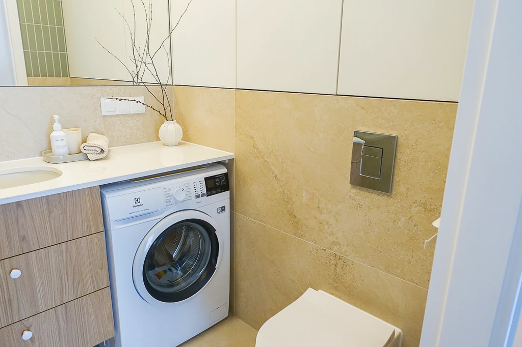 - Ausstattung: Kühlschrank, Backofen, Geschirrspüler, Waschmaschine