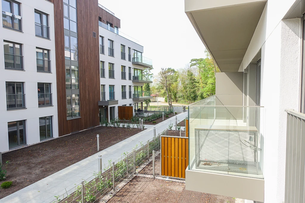 Die exklusive Wohnanlage besteht aus zwei Gebäuden mit außergewöhnlicher Architektur. Sie befindet sich in einzigartiger Lage – direkt an der ersten Bebauungslinie zur Ostsee, nur ca. 60 Meter vom Strand entfernt. Auf der anderen Seite erstreckt sich die Zatoka Wrzosowska und die Dziwna.
