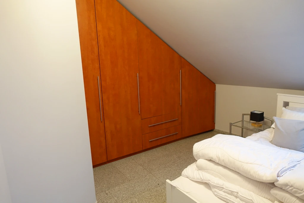 Etage 2: - Dachgeschoss mit leichten Schrägen - Wohnzimmer mit Küchenzeile, Einbaumöbeln, Kühlschrank, Elektrokochfeld und Spüle - Schlafzimmer mit Einbauschrank - Badezimmer mit Dusche, Waschbecken, Waschmaschine und WC - Balkon mit Terrakottafliesen