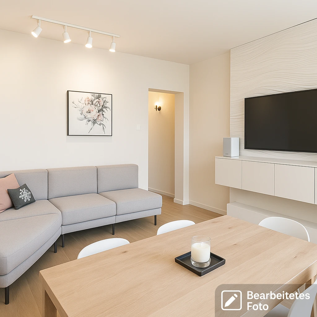 - Wohnzimmer mit offener Küche: ca. 30,5 m² (Wohnbereich 20 m², Küche 10,5 m²), hell und einladend, mit modernem Küchenensemble in Weiß. Die Küche ist mit Fenster ausgestattet und kann bei Bedarf wieder abgetrennt werden. Sie verfügt über: Induktionskochfeld, eingebauten Elektroofen, Geschirrspüler, Dunstabzugshaube, freistehenden Kühlschrank und Spüle.