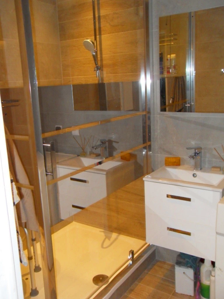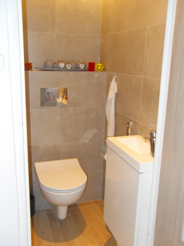 Die modernisierte Badezimmerlandschaft umfasst: - Ein stilvolles Bad (ca. 6 m²) mit einer großzügigen, ebenerdigen Dusche für zwei Personen, neuer Keramik und hochwertigen Armaturen. - Ein separates WC (ca. 1 m²) mit einem kleinen Handwaschbecken und zusätzlichen Einbauschränken – komplett neu gefliest.