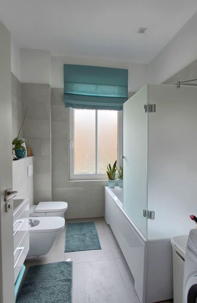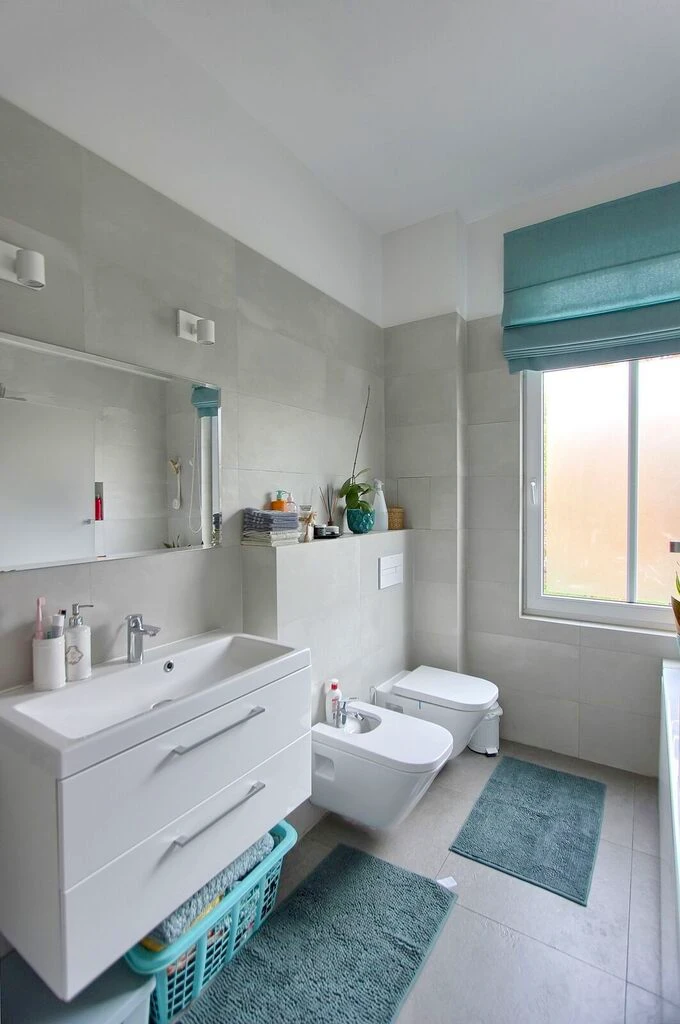 - Badezimmer: helles Bad mit Badewanne, formschöner Keramik und modischem Fliesenboden