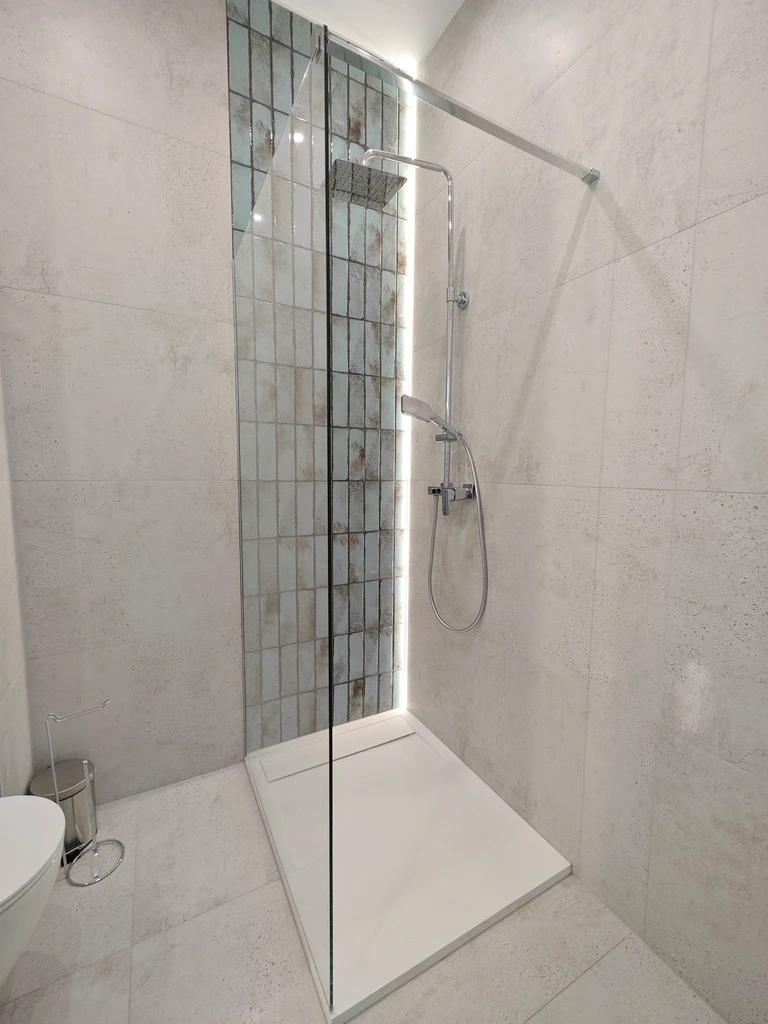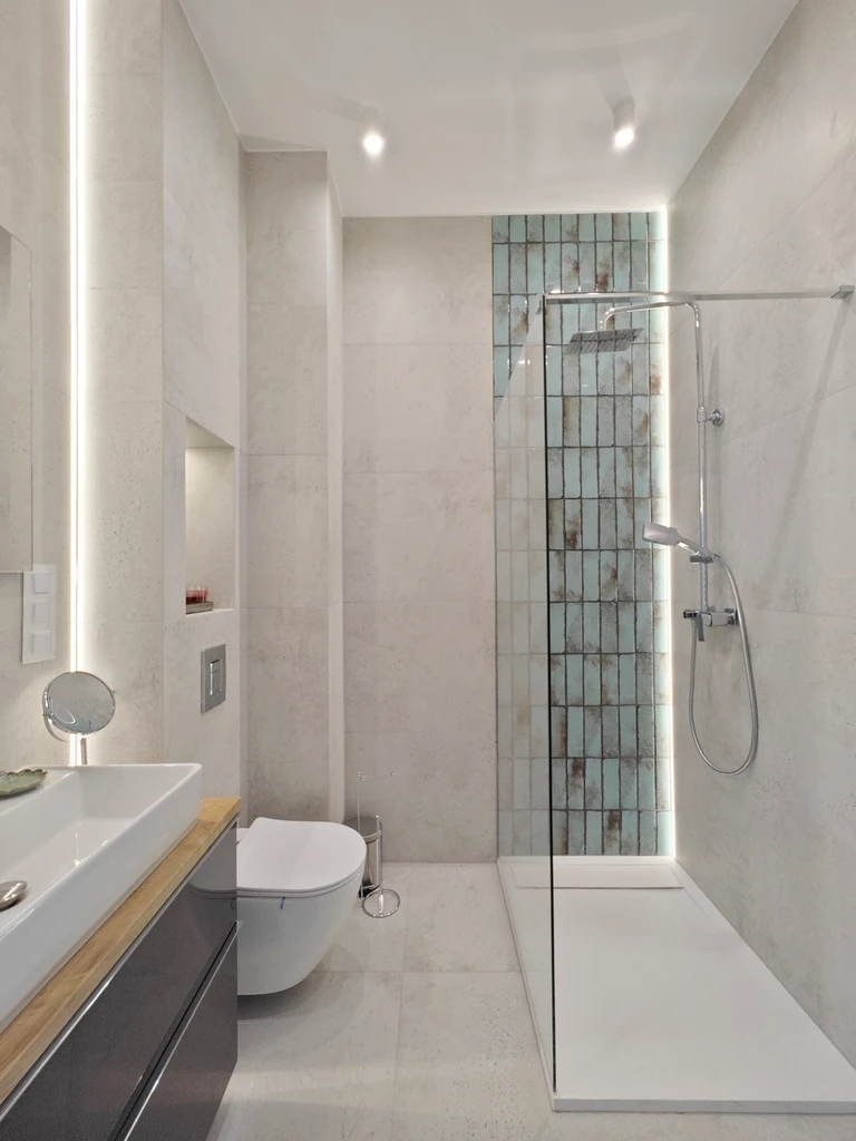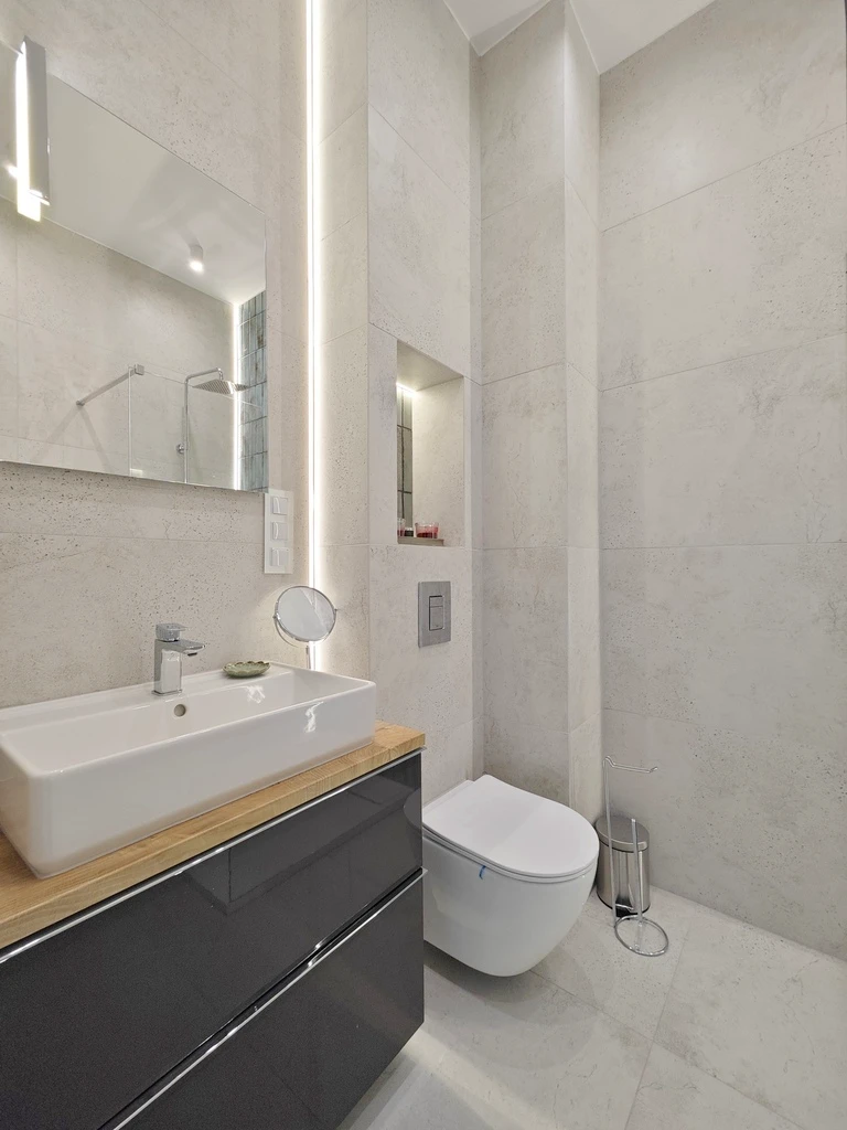 Design & Funktion vereint: Hochwertige Fliesen an Wänden und Boden, bodengleiche Glasduschkabine, Waschtisch mit Unterschrank, wandhängendes WC, Handtuchheizkörper sowie Glastür sorgen für ein modernes Ambiente. -