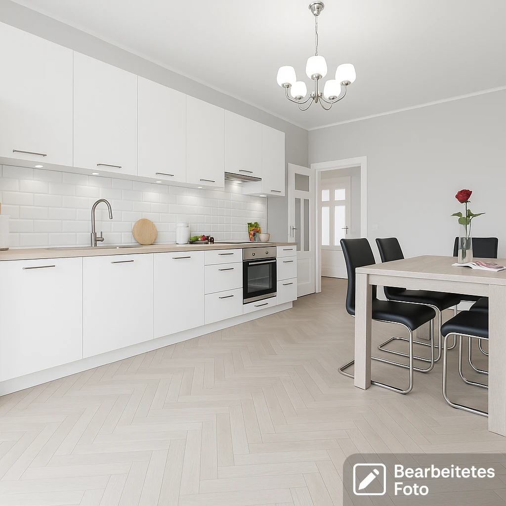 - Moderne Wohnküche (ca. 11 m²) mit Essbereich, ausgestattet mit Einbauküche, Gasherd, Backofen, Geschirrspüler, Kühlschrank, Gefrierfach sowie Esstisch mit Stühlen.