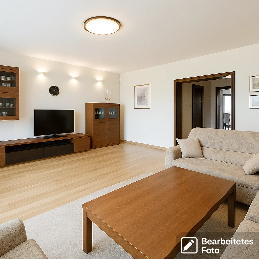 - Bodenbeläge: Edle Holzböden in Wohn- und Schlafräumen, Fliesen in Küche, Badezimmern und Flur