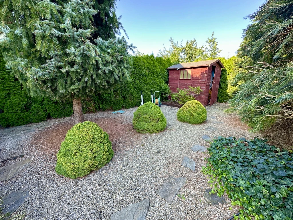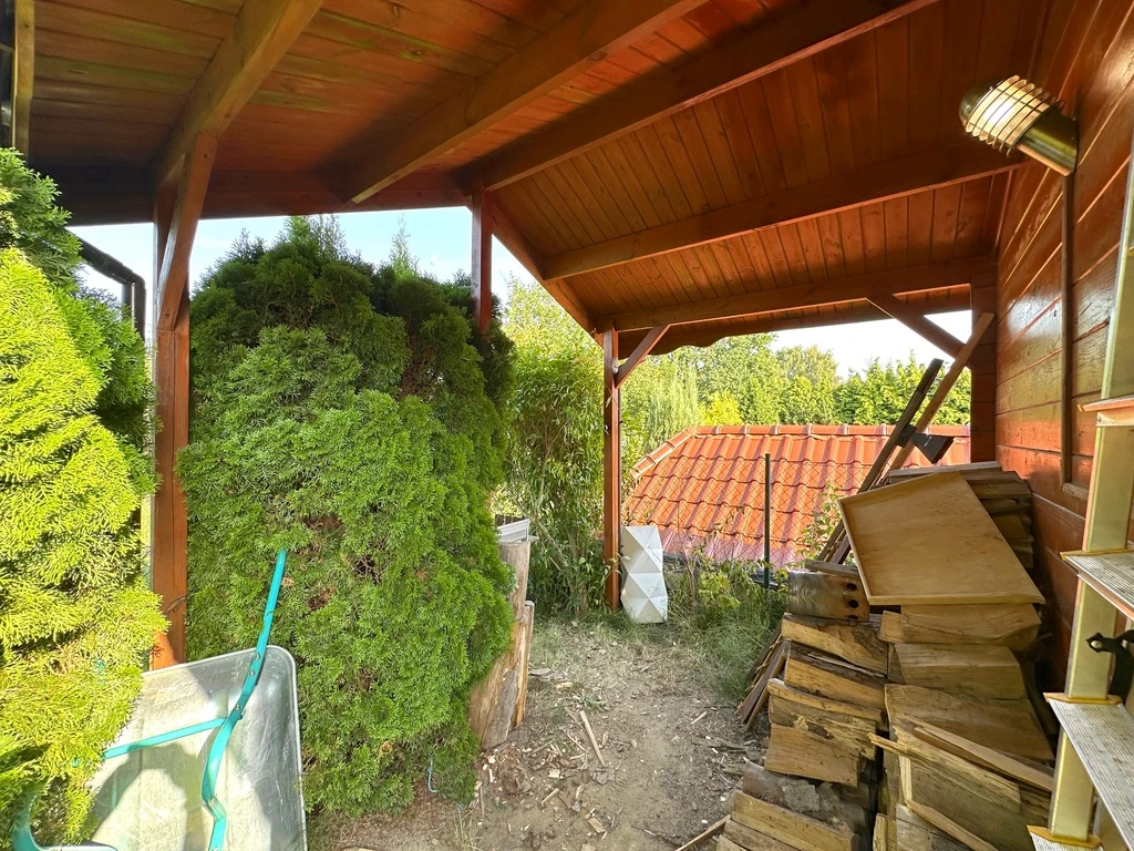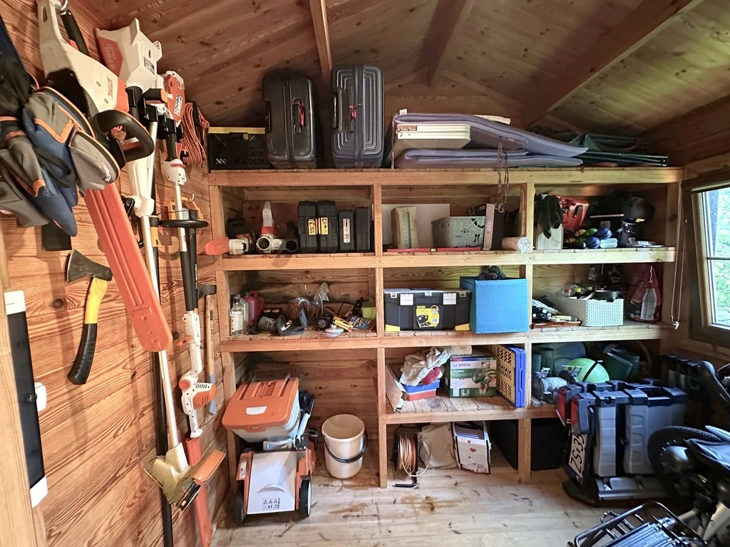 Am Ende des Grundstücks befindet sich ein gemütliches Gartenhaus mit Stromanschluss und Kamin, das aktuell als „Männerhöhle“ und Geräteschuppen genutzt wird. Dieses beheizbare Häuschen ist der perfekte Ort für gesellige Abende oder als persönlicher Rückzugsort – ein echtes Highlight und eine clevere Erweiterung der Wohnfläche.