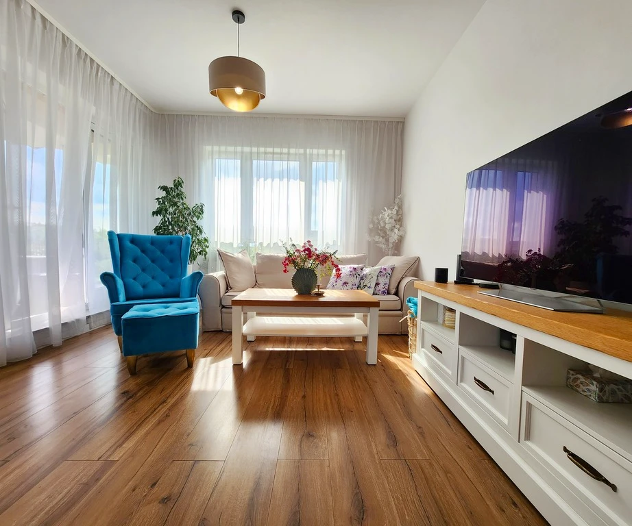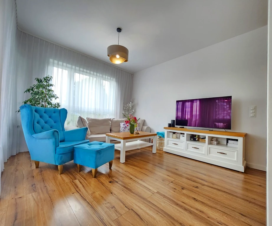 Aufteilung und Ausstattung: - Geräumiges Wohnzimmer mit einer offenen Küche (Küchenzeile) - Zwei Schlafzimmer mit Flächen von jeweils 12 m² - Badezimmer mit moderner Ausstattung, Fläche: 5,5 m² - Zugang zu einem eigenen Garten, ideal zur Erholung im Freien - Balkon für zusätzlichen Komfort - Fenster aus Kunststoff sorgen für eine gute Isolierung - Vollständig umzäuntes Grundstück
