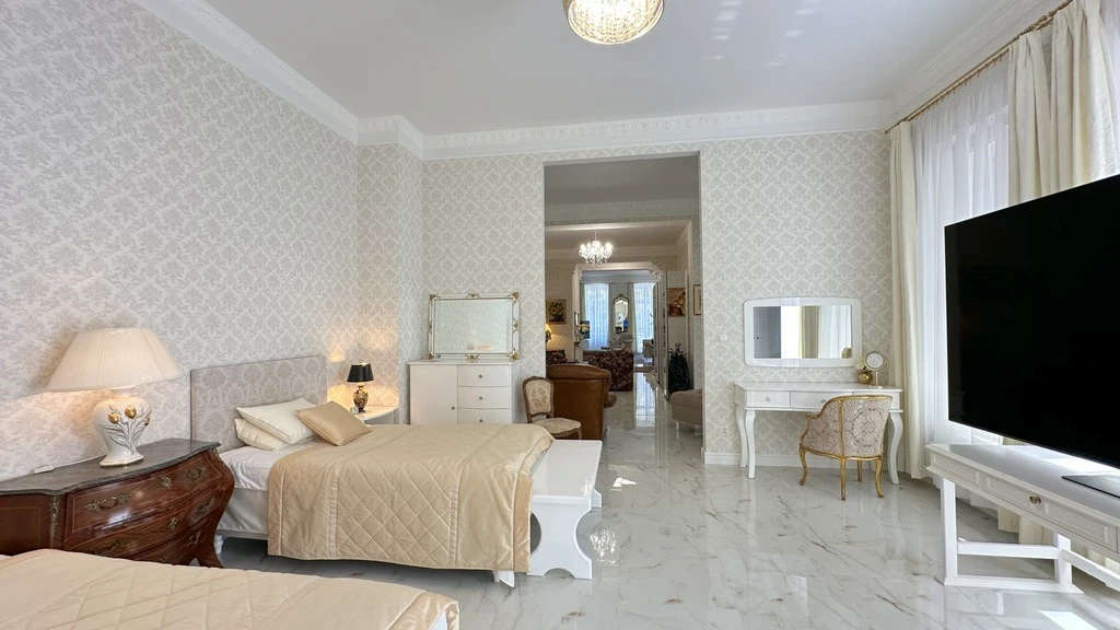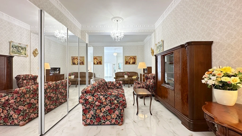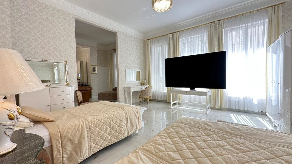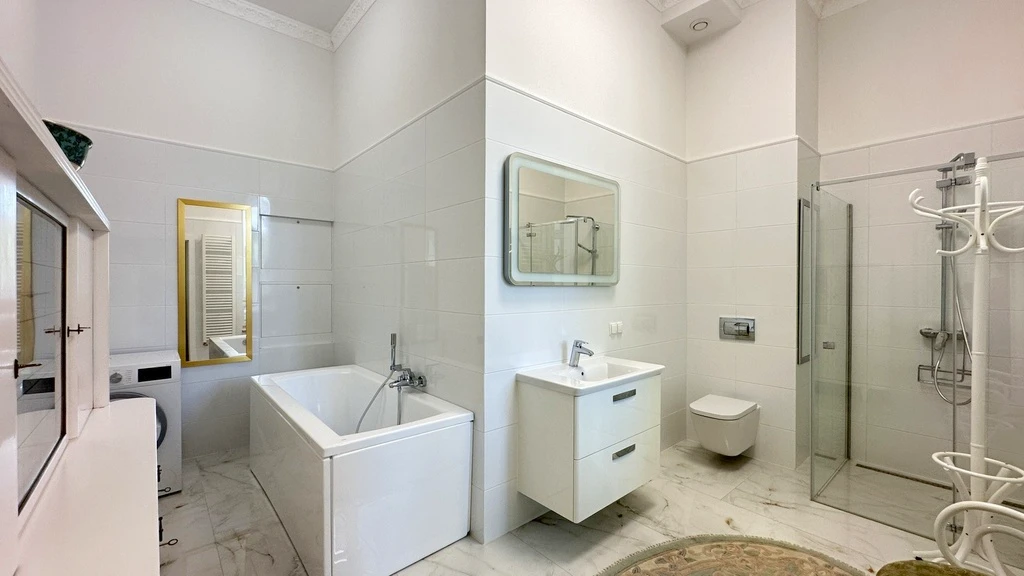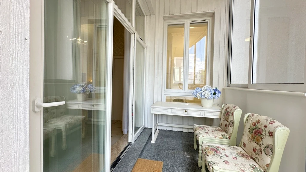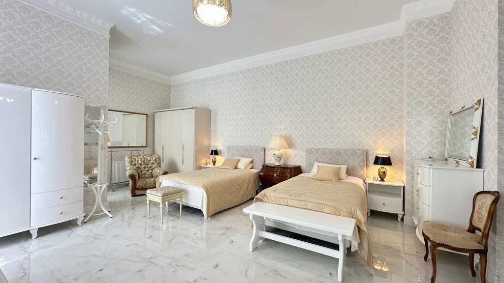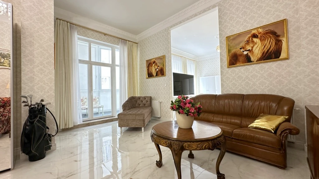 Die Wohnung besticht durch eine beeindruckende Raumhöhe von 3,6 m, drei separate Balkone, einen Kellerraum sowie durch moderne Sicherheitsmerkmale wie Videoüberwachung und Zugangsschutz. Ein Aufzug sorgt für zusätzlichen Komfort.