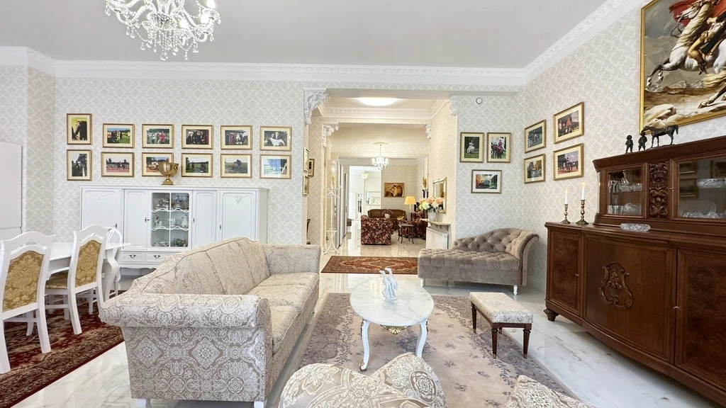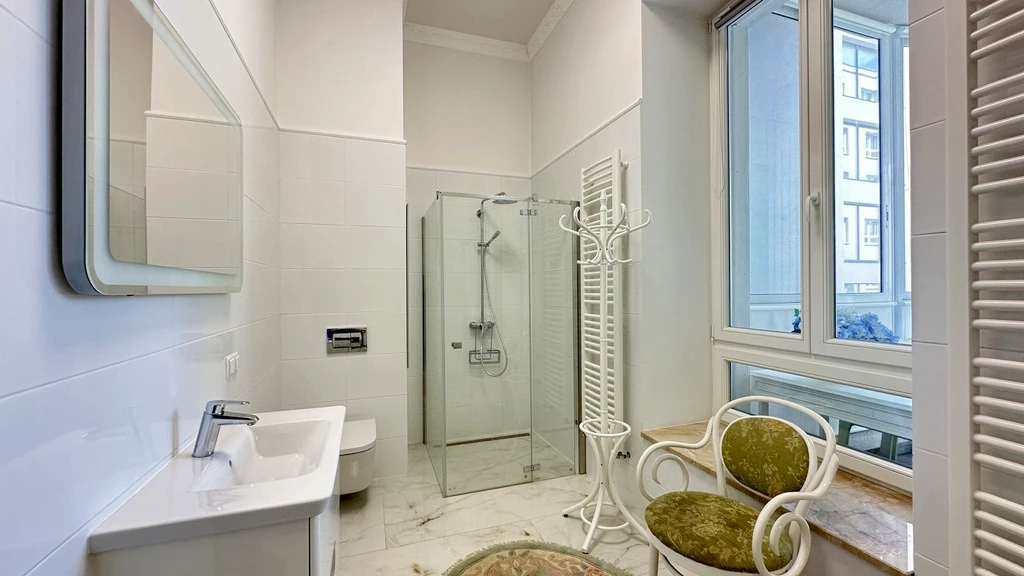 Das Gebäude beeindruckt durch seine originale, kunstvoll restaurierte Vorkriegsfassade und ein stilvolles Treppenhaus mit eleganten Fliesen, hochwertiger Beleuchtung und einem modernen Aufzug. Trotz der historischen Fassade wurde das Innere des gesamten Wohnquartiers neu aufgebaut. Dabei wurde großer Wert auf die Erhaltung der ursprünglichen Proportionen, Raumaufteilung und die Verwendung hochwertiger Materialien gelegt.