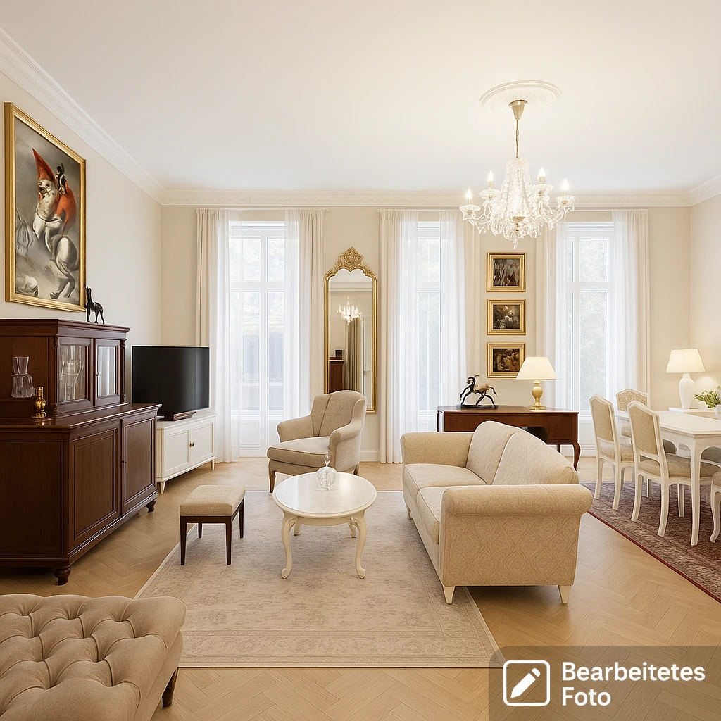 - Repräsentatives Wohnzimmer mit großen Fenstern und eleganter Tischlerei
