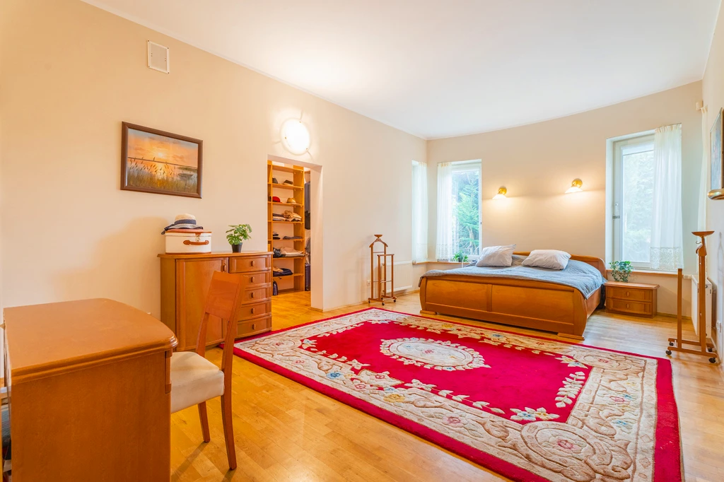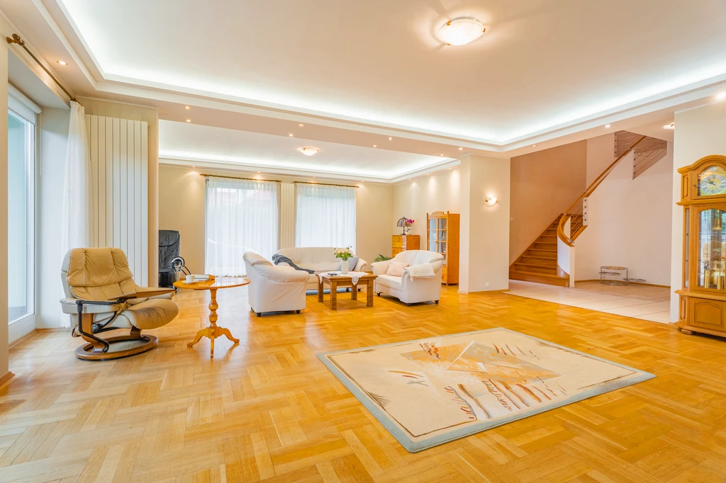 Erdgeschoss – Der zentrale Lebensbereich: - Freistehende Doppelgarage mit automatischem Tor (33 m²) - Großzügiges, helles Wohnzimmer (67 m²) mit hochwertigem Eichenboden, dreifachverglasten einbruchhemmenden Holzfenstern, Kamin und Zugang zur großen Terrasse (73 m²) - Stilvoller Essbereich (21 m²) – perfekt für Familienfeiern - Komplett ausgestattete Küche mit Kochinsel und Premium-Elektrogeräten (16 m²) - Hauptschlafzimmer (24 m²) mit privatem Bad und begehbarem Kleiderschrank (8 m²) - Elegantes Foyer mit repräsentativer Treppe - Gäste-WC und maßgefertigte Einbauschränke