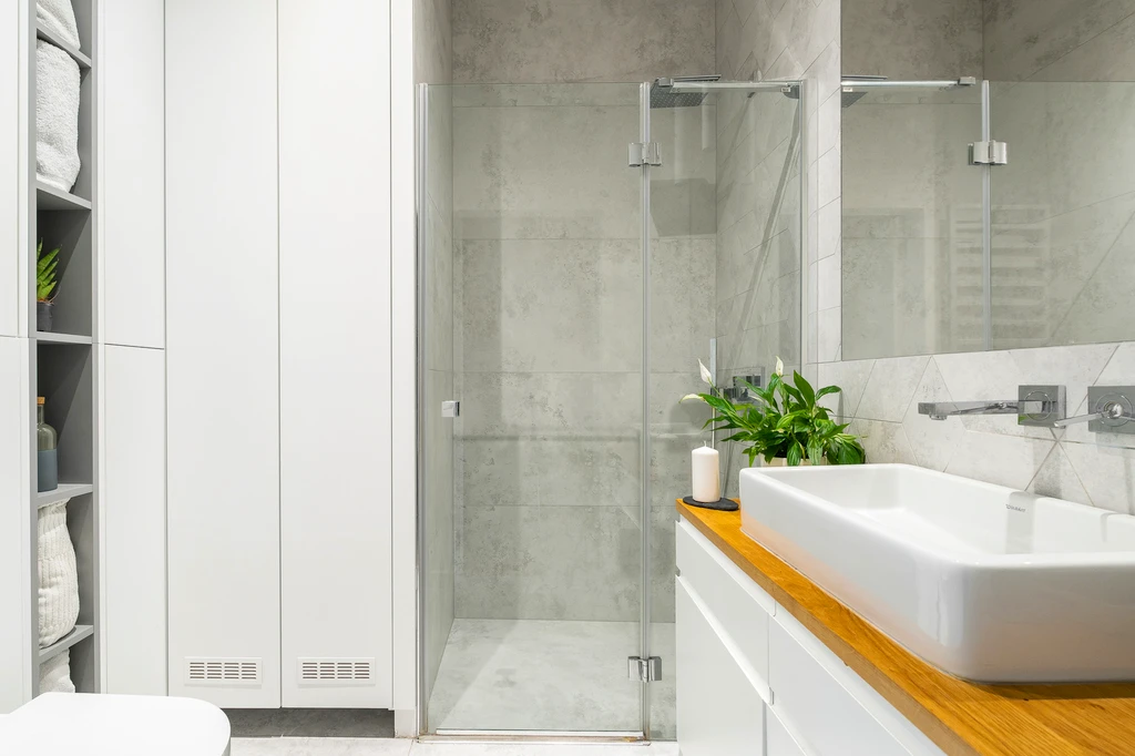 - Hochwertige Badmöbel mit integrierter Waschmaschine und Trockner sorgen für ein aufgeräumtes Raumkonzept.