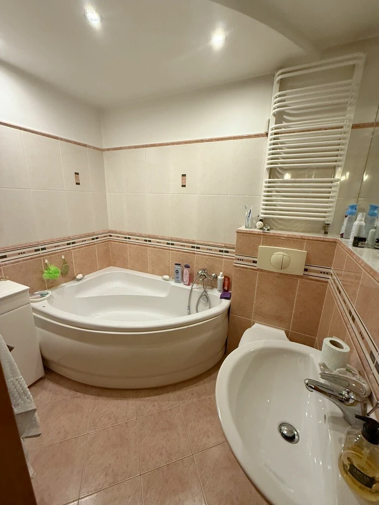 - Badezimmer: Zeitlos gefliest, mit Badewanne, Waschbecken und WC — 2023 wurden die Wasser- und Abwasserleitungen vollständig erneuert