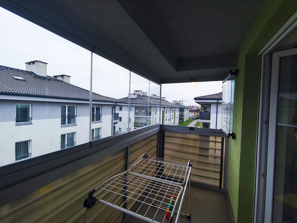 Überdachter Balkon (5,7 m²) – mit modernen, aufklappbaren Fenstern ausgestattet, schafft er eine gemütliche und windgeschützte Zone zum Entspannen im Freien.
