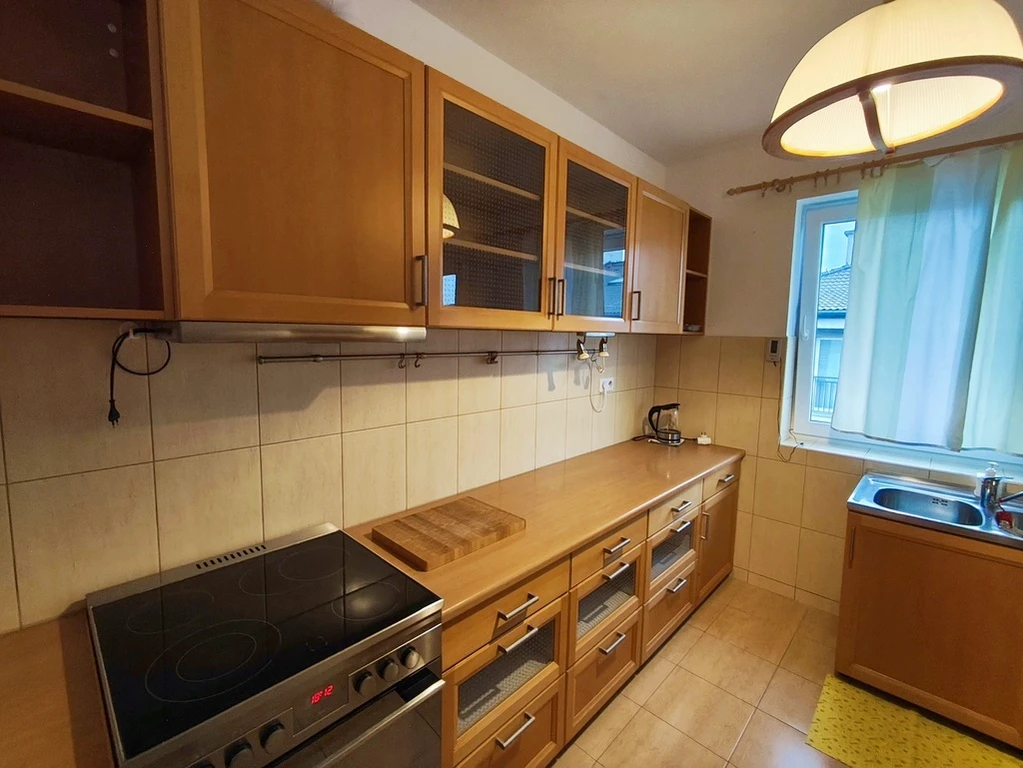 Helle Küche (8,27 m²) – modern gestaltet als offener Küchenbereich mit Fenster. Komplett möbliert und mit allen wichtigen Haushaltsgeräten ausgestattet: Kühlschrank, Herd, Ofen, Geschirrspüler und Waschmaschine.