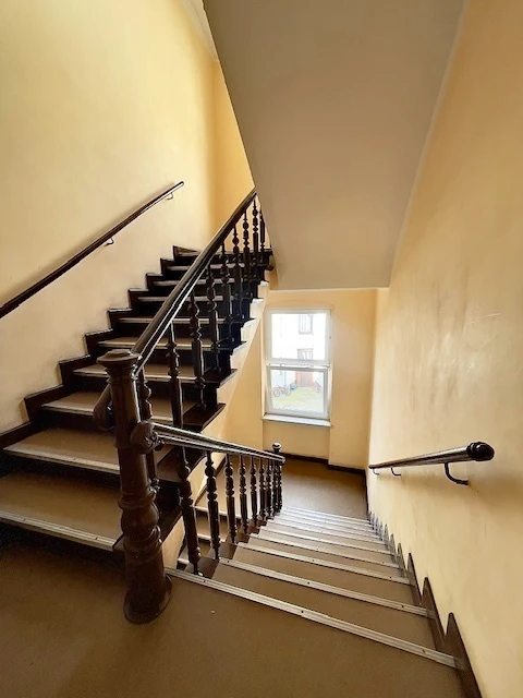 Das Treppenhaus ist sauber und gepflegt – typisch für liebevoll restaurierte Altbauten in zentraler Stadtlage.