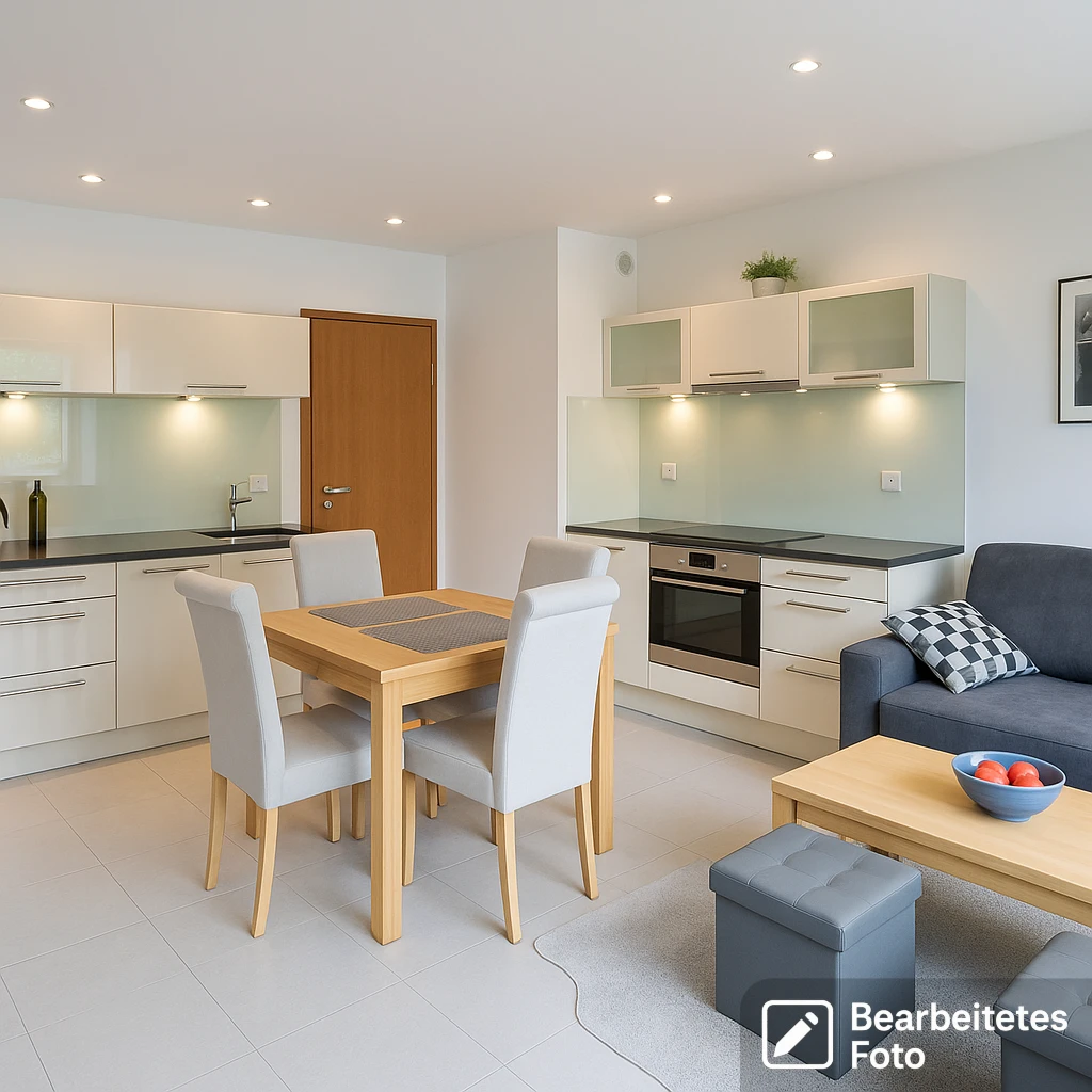 - Wohnzimmer und Küche mit pflegeleichten Fliesenböden, Wände hell gestrichen und verspachtelt.