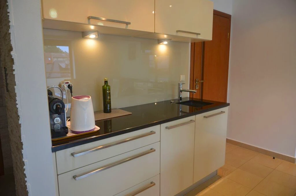 - Funktionale Küchenzeile, maßgefertigt, ausgestattet mit hochwertigen Geräten: Geschirrspüler, Induktionskochfeld, Backofen mit Mikrowellenfunktion und Dunstabzugshaube.