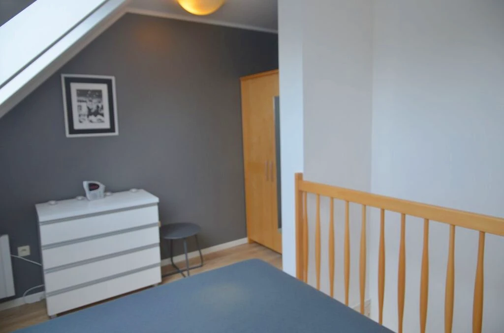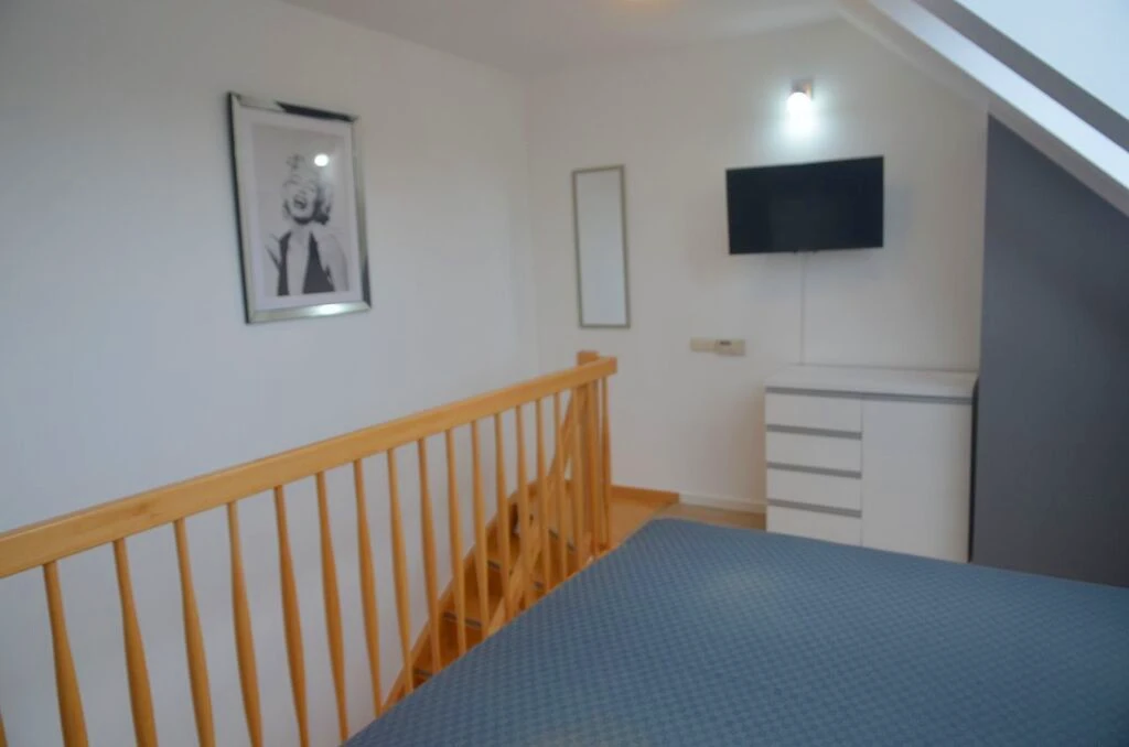 - Ruhiges Schlafzimmer (ca. 10 m²) mit großem Bett und Kleiderschrank. Fenster der Marke Velux mit Dreifachverglasung, Boden mit hochwertigen Paneelen.