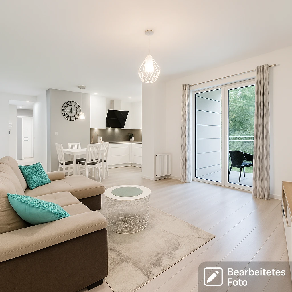 - Heller Wohnbereich mit offener Küche und Zugang zu einem großen Balkon