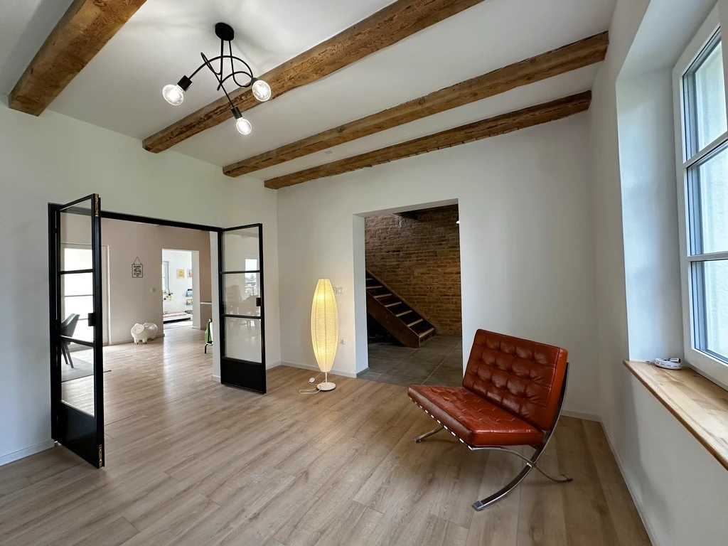 Das Haus mit einer großzügigen Wohnfläche von 250 m² wurde vollständig saniert: Die sichtbaren Holzbalken und hochwertige Holzelemente harmonieren mit einem modernen, eleganten Stil in hellen Farbtönen – ein Ort mit Seele und Charakter.