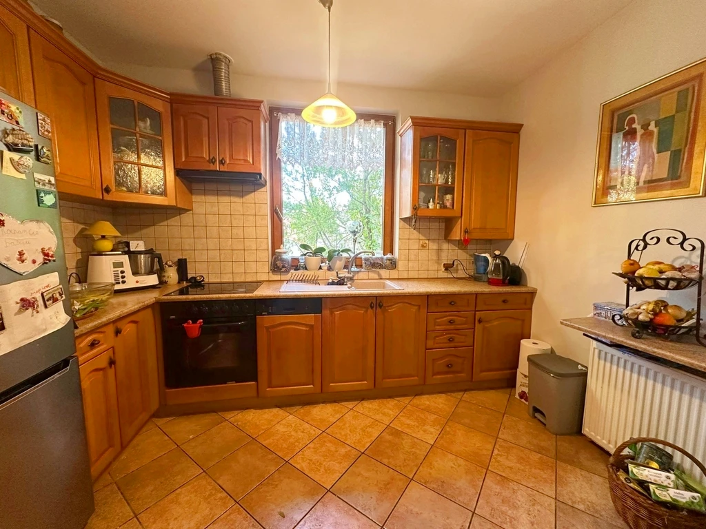 - Die Küche ist mit Holzfronten und allen notwendigen Haushaltsgeräten ausgestattet.