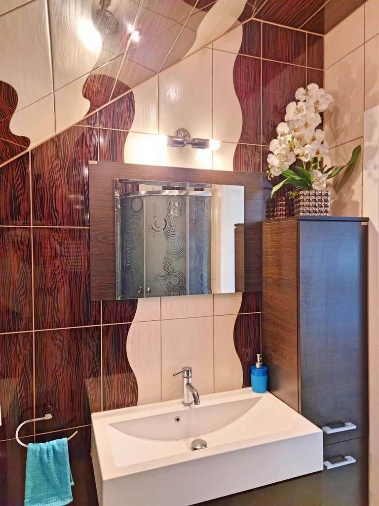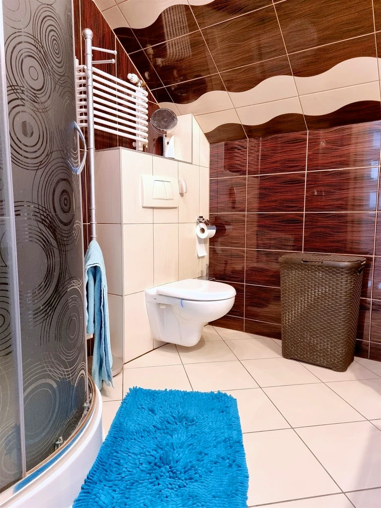 Die moderne Badezimmerausstattung beinhaltet eine Dusche, WC, Waschbecken und Waschmaschine.
