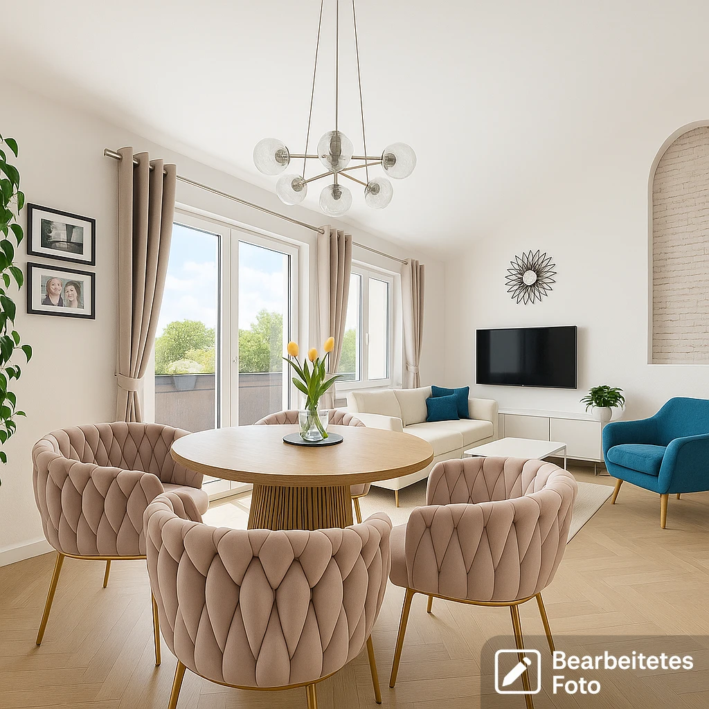 Das großzügige und offen gestaltete Wohnzimmer wird durch bodentiefe Fenster mit natürlichem Licht durchflutet und führt direkt auf den nach Süden ausgerichteten Balkon – ideal für entspannte Stunden in der Sonne. Der Wohnbereich ist harmonisch mit der stilvollen, offenen Küche mit Essplatz verbunden. Die weiße maßgefertigte Küchenzeile verfügt über moderne Einbaugeräte: Kühlschrank, Geschirrspüler, Backofen, Mikrowelle und eine Kochinsel mit Induktionskochfeld.