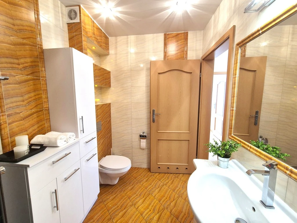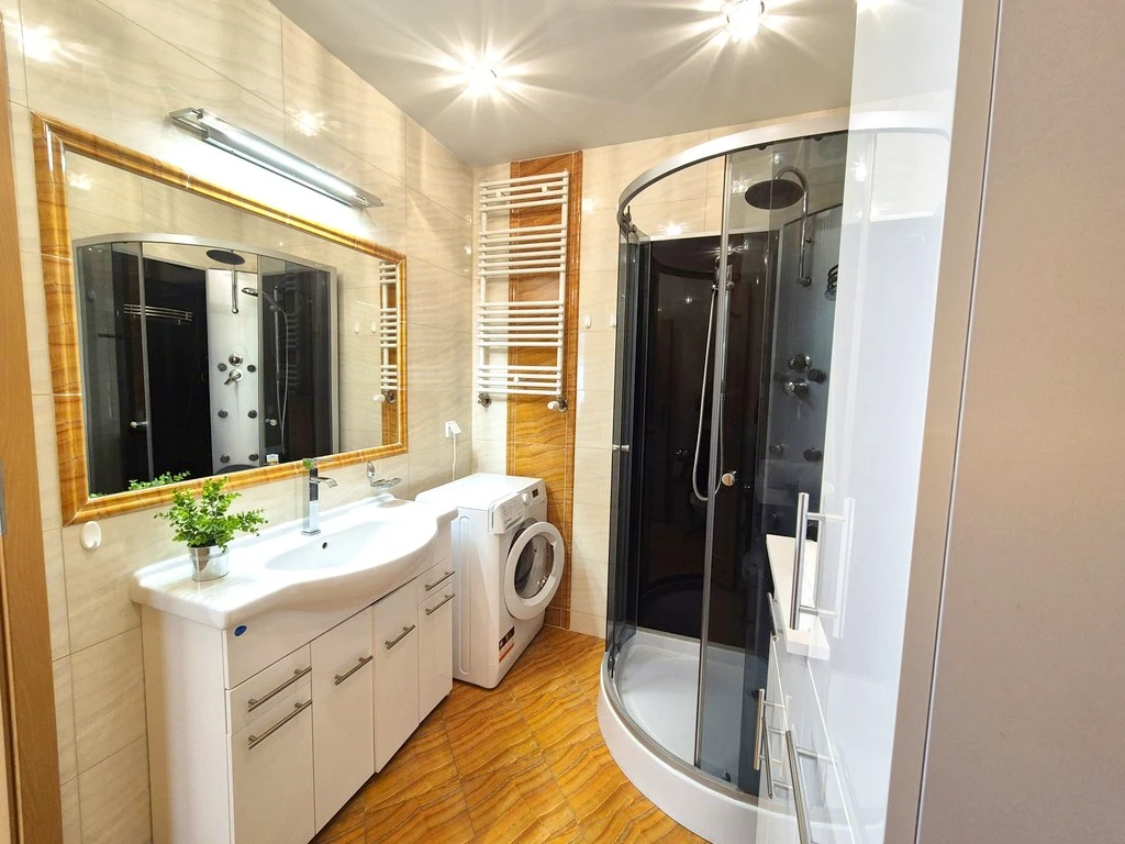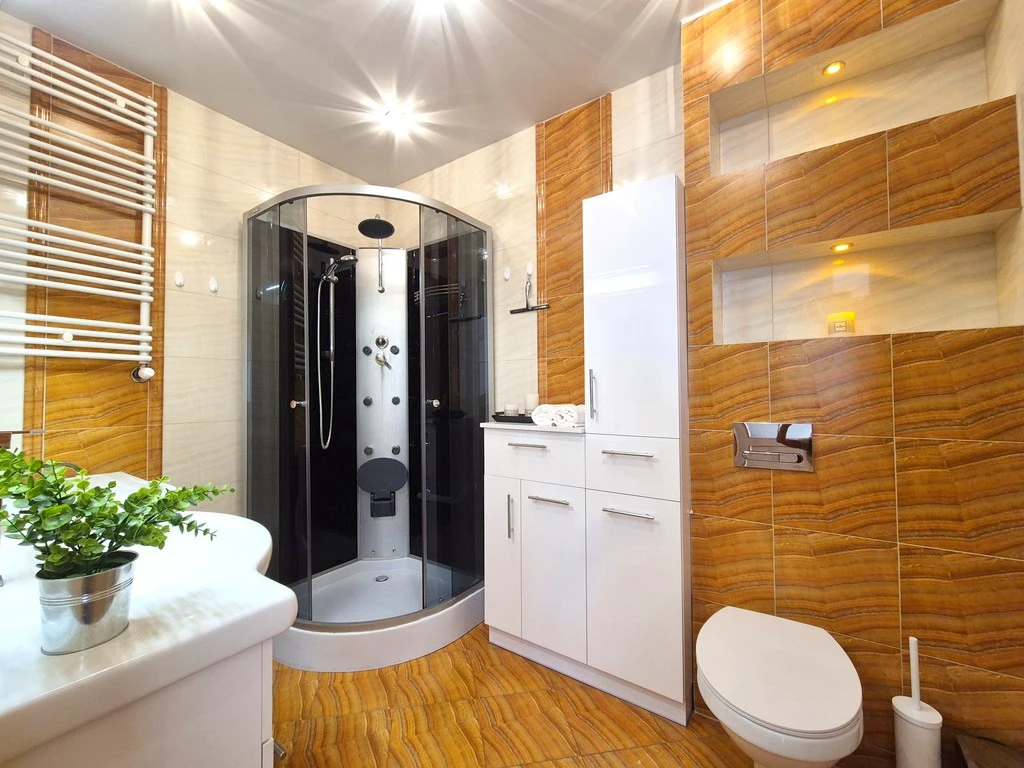 - Badezimmer: 5,4 m² – modern gefliest, ausgestattet mit Waschbecken, Hänge-WC, Duschkabine mit Hydromassage und Deckenbeleuchtung