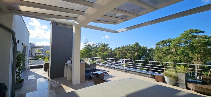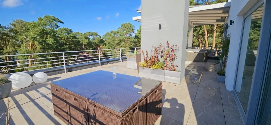 Das Herzstück der Immobilie ist die spektakuläre Dachterrasse. Auf ca. 80 m² eröffnet sich ein Rückzugsort unter freiem Himmel – mit gemütlichem Loungebereich, überdachtem Essplatz und einem privaten Jacuzzi mit Blick auf die Baumkronen des angrenzenden Küstenwaldes.