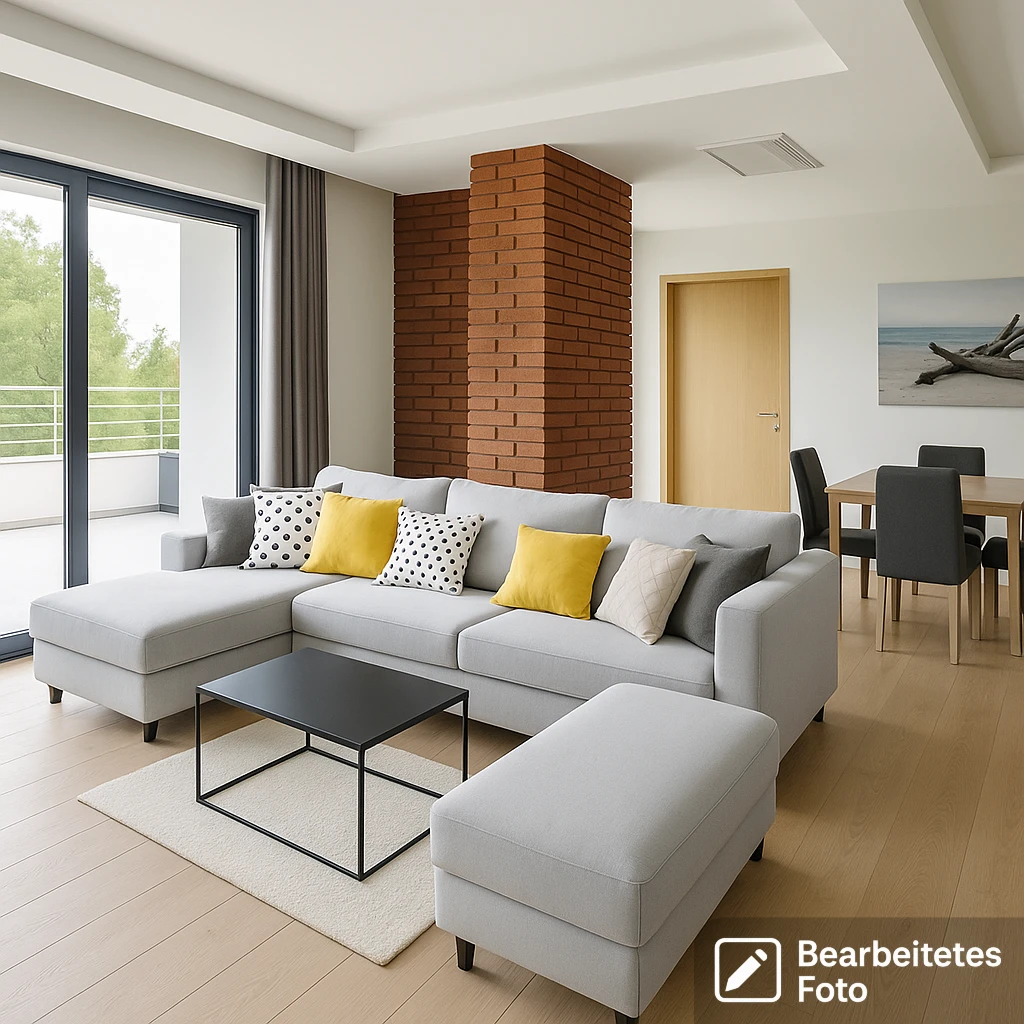 - Heller Wohnbereich mit offener Küche und großen Fensterflächen