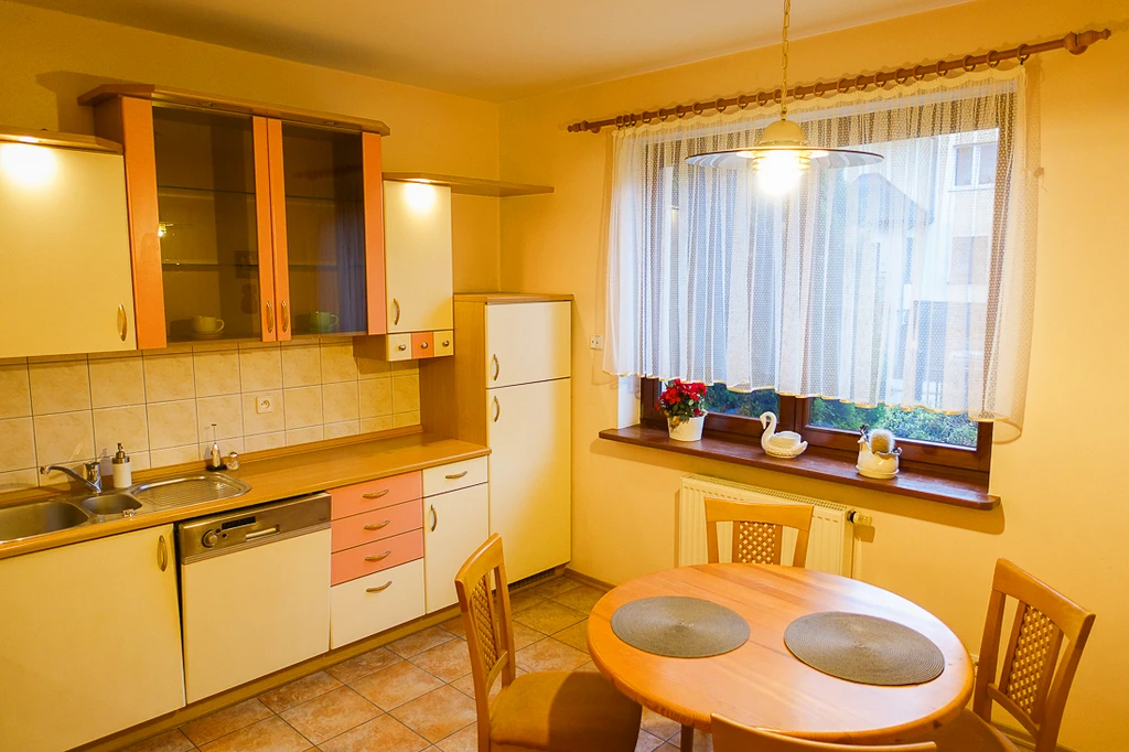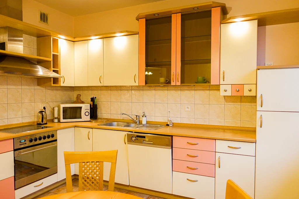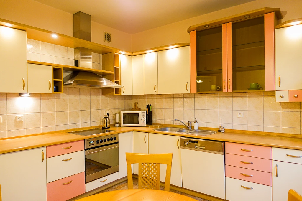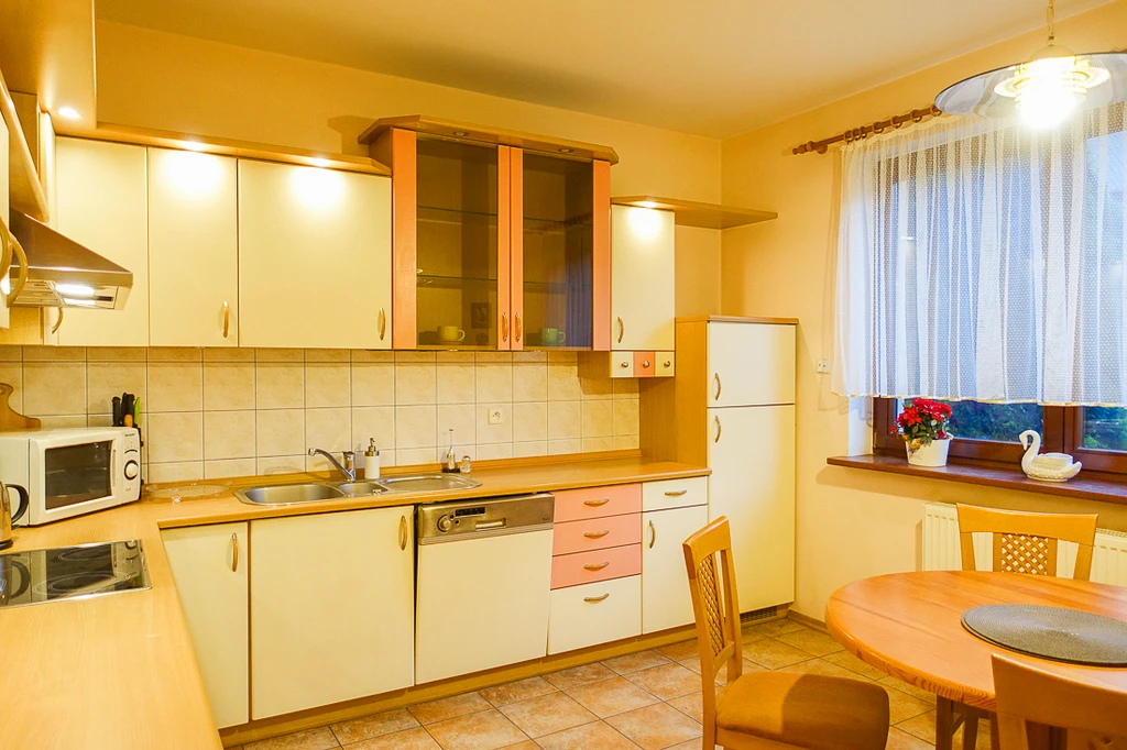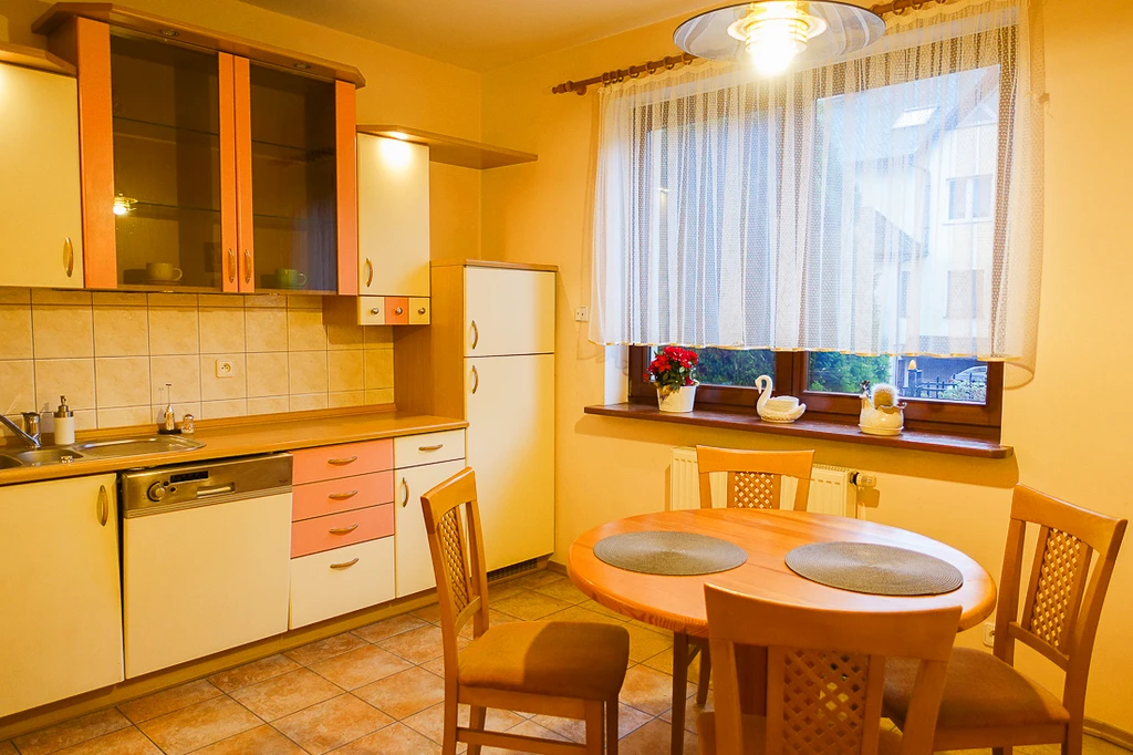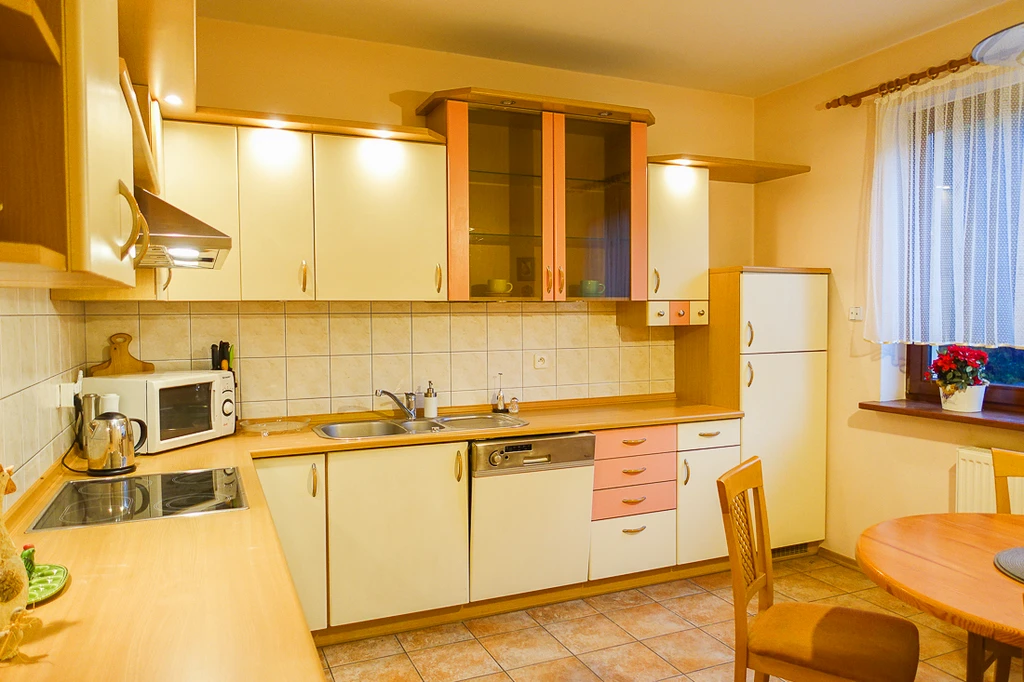 - Küche (13,5 m²): Separater, quadratisch geschnittener Raum mit Fenster. Voll ausgestattet mit Einbauküche und modernen Geräten: Kühlschrank, 60 cm Geschirrspüler von WHIRLPOOL, Elektroherd mit Glaskeramikkochfeld und Backofen von AMICA sowie Dunstabzugshaube. Essbereich mit Tisch und Stühlen.