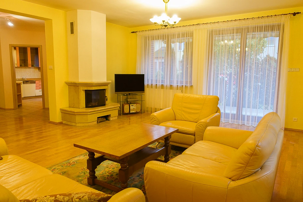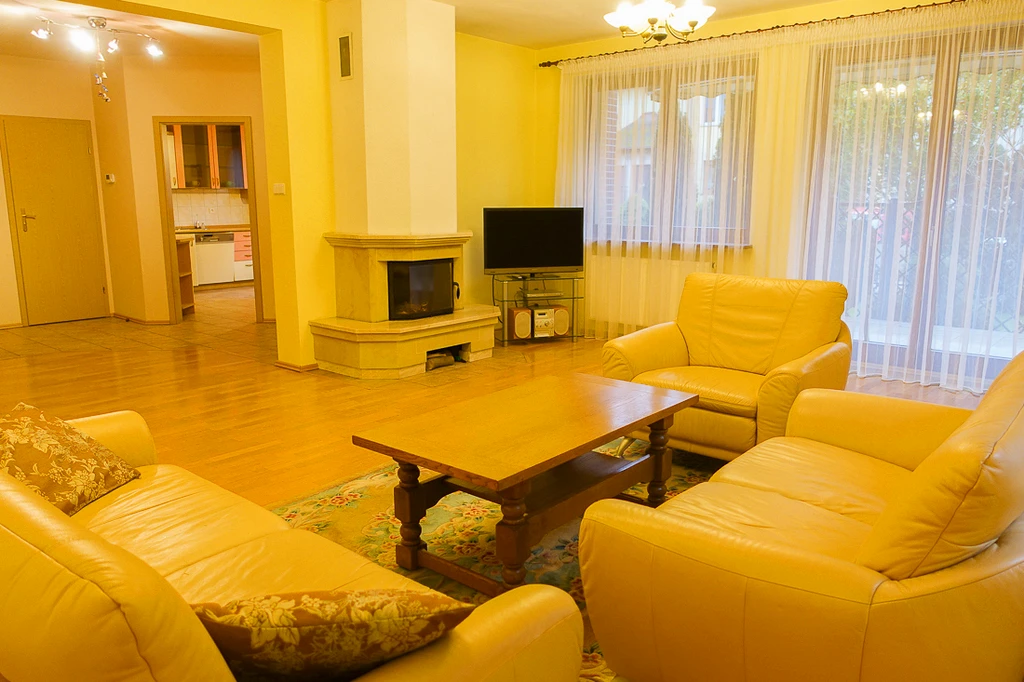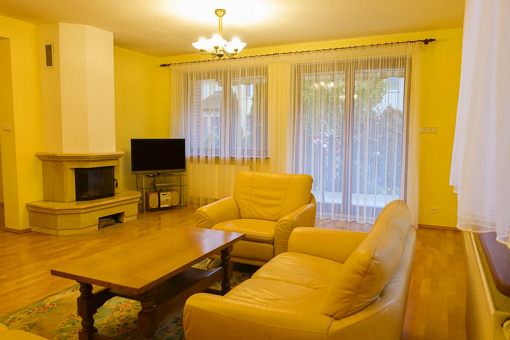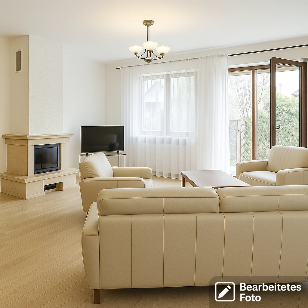 - Wohnzimmer (32 m²): Geräumiger Wohnbereich mit Kamin und Zugang zum ca. 16 m² großen, nach Süden ausgerichteten Terrassenbereich und anschließendem Garten mit Bäumen und Zierpflanzen.