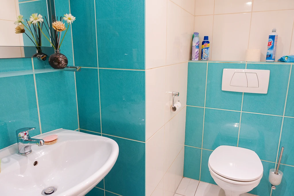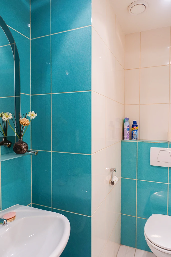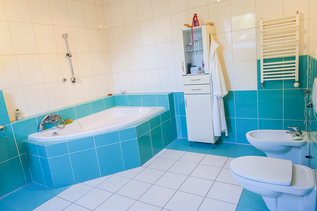 - Ausstattung: Badewanne, Fenster, Waschbecken, Handtuchheizkörper, WC, Bidet