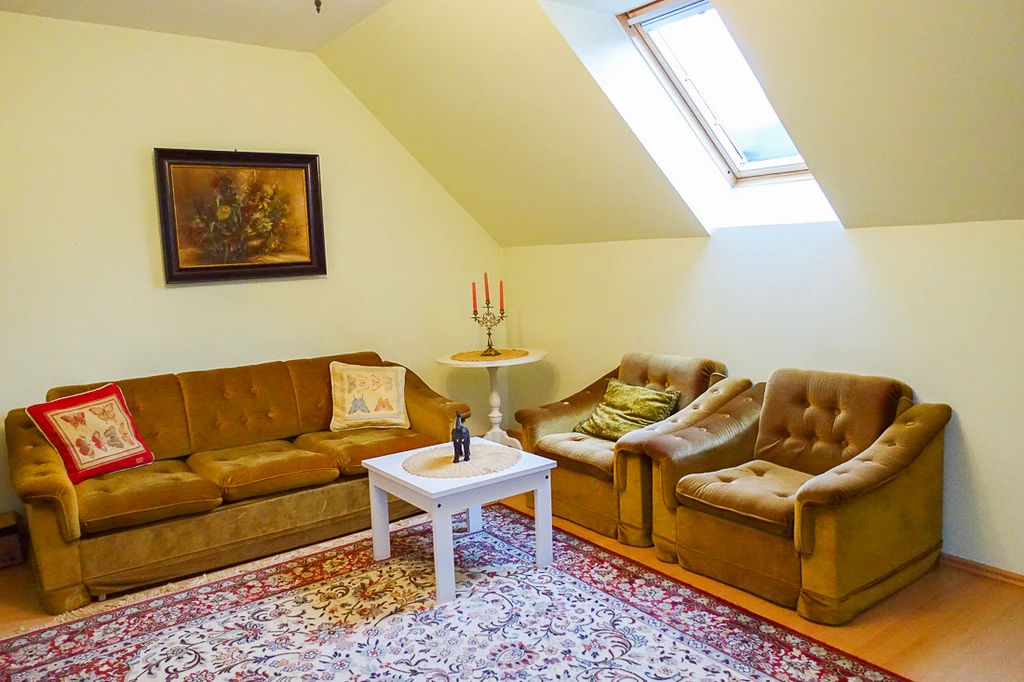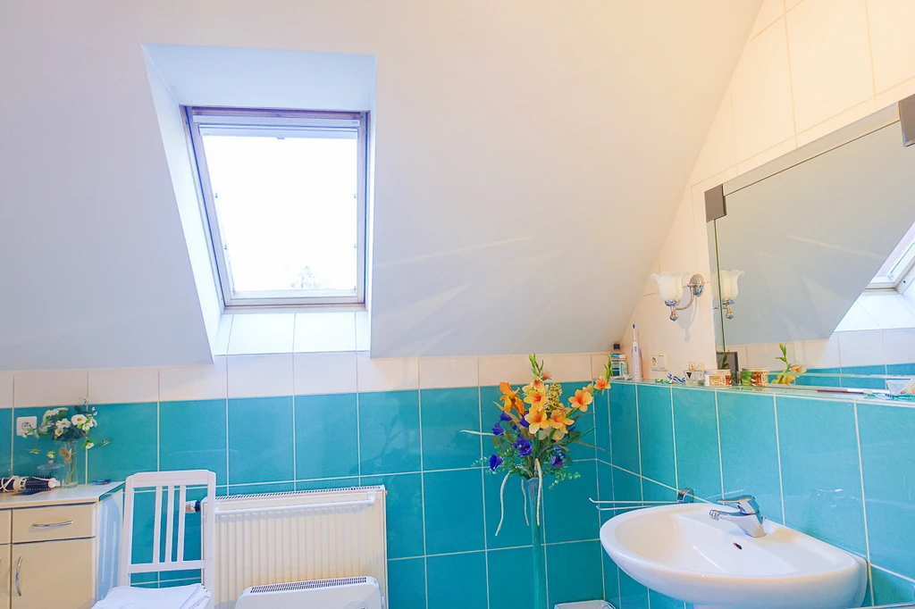 - Familienbad (11,1 m², 13,5 m² Grundfläche): Ausgestattet mit Badewanne, Waschbecken, WC, Bidet und Dachfenster. Vorbereitung für eine zusätzliche Duschkabine vorhanden.