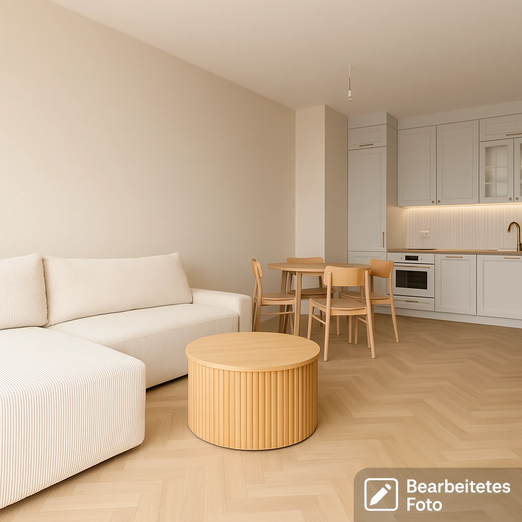 Die gesamte Ausstattung wurde mit hochwertigen Premium-Materialien ausgewählt und geschmackvoll kombiniert. Die Küche ist mit modernem Einbaugerät ausgestattet: Kühlschrank, Backofen, Geschirrspülmaschine. Im Wohnbereich befindet sich komplettiertes Mobiliar inklusive TV-Anschluss.