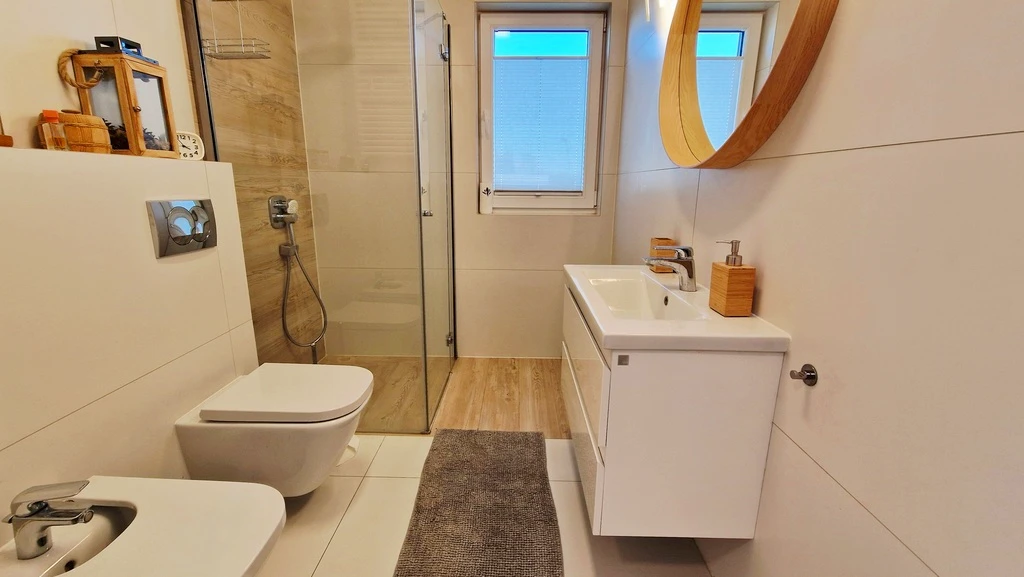 Die offene Küche ist funktional in den Wohnraum integriert und schafft ein großzügiges Wohngefühl. Zwei voll ausgestattete Badezimmer bieten Komfort für Familien oder Paare mit gehobenem Anspruch. Kunststofffenster sorgen für gute Isolierung und sind pflegeleicht.