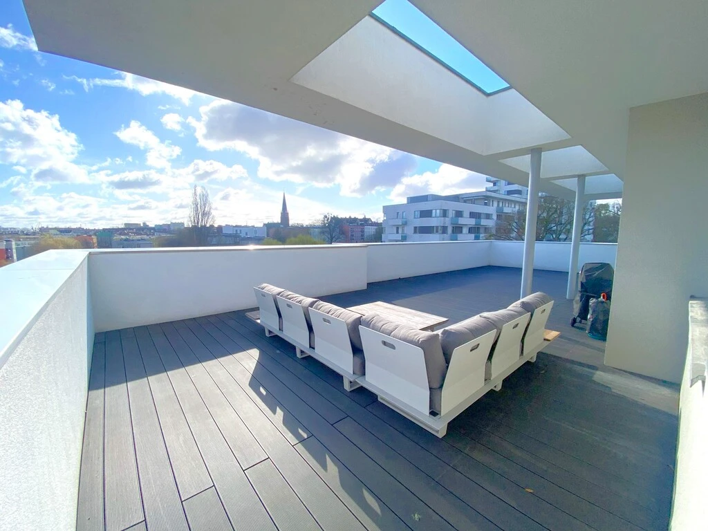 - Großzügige Terrasse mit Panoramablick auf die Stadt – verläuft entlang dreier Seiten der Wohnung (Ausrichtung Ost–Süd–West)