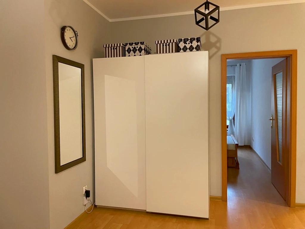 Das Schlafzimmer verfügt über eine maßgefertigte Einbaukleiderschranklösung und außenliegende Rollläden für optimalen Komfort und Privatsphäre. Das Badezimmer ist großzügig geschnitten (ca. 6,8 m²) und bietet ausreichend Raum für Komfort und Funktionalität.